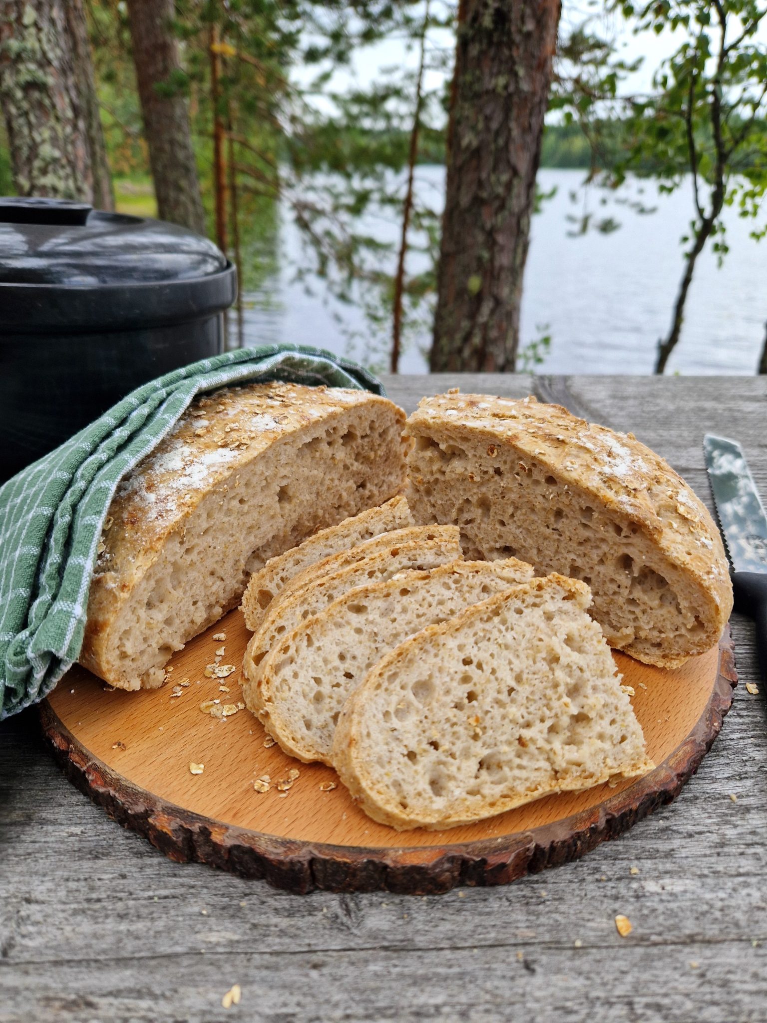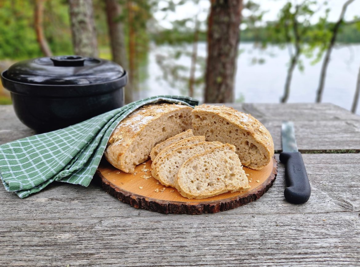 Keliaakikkoystäväni pyysi minulta gluteenittoman pataleivän ohjetta. Ohjetta, jossa ei olisi siemeniä. Sellaista peruspataleipää. Valurautapatani on liian suuri, joten leivoin pataleivän mökillä keraamisessa padassa. Täytyy tunnustaa, että tämä oli ensimmäinen gluteeniton pataleipäkokeiluni. Kiva saada kokeilla ja oppia uutta.