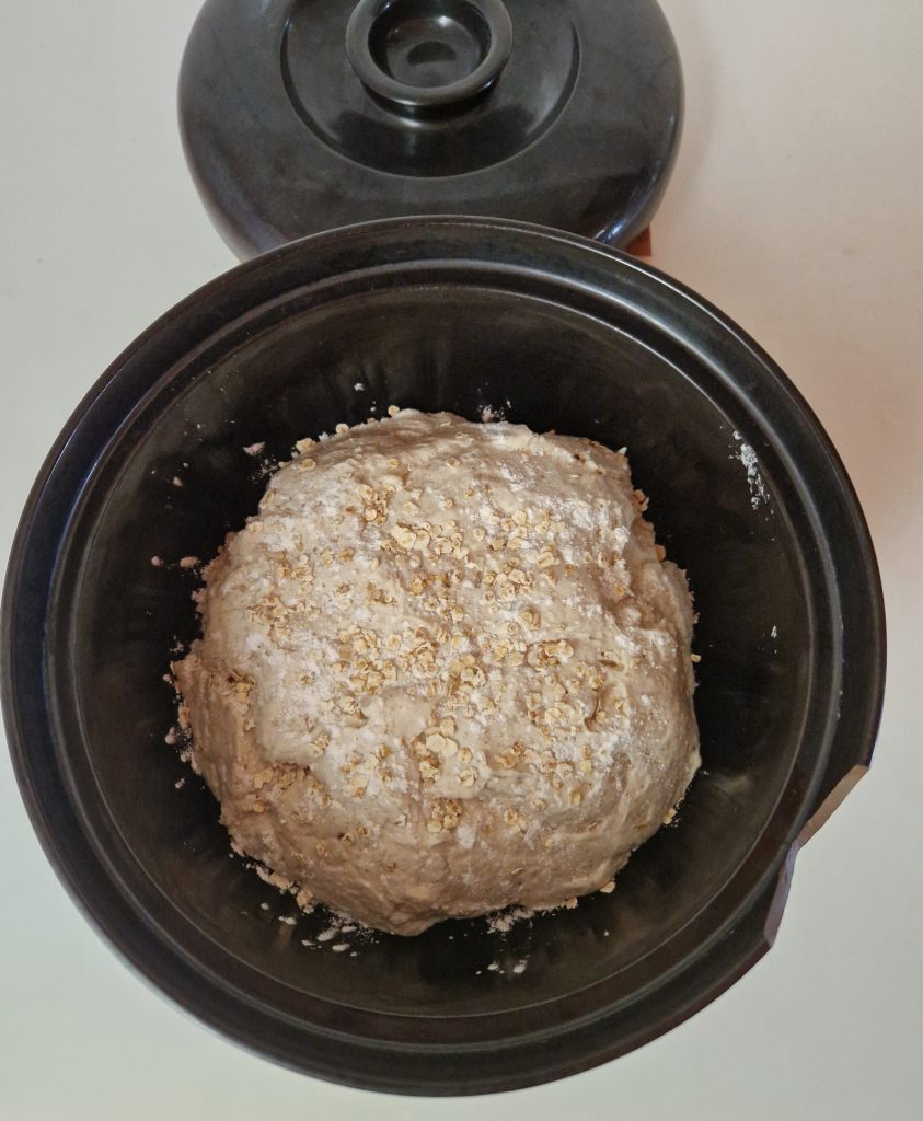 Leivän ei tarvitse olla tässä vaiheessa siloposkinen, sillä uuni tasoittaa rypyt. Päälle ripotellaan hiven jauhoseosta ja gluteenittomia kaurahiutaleita.