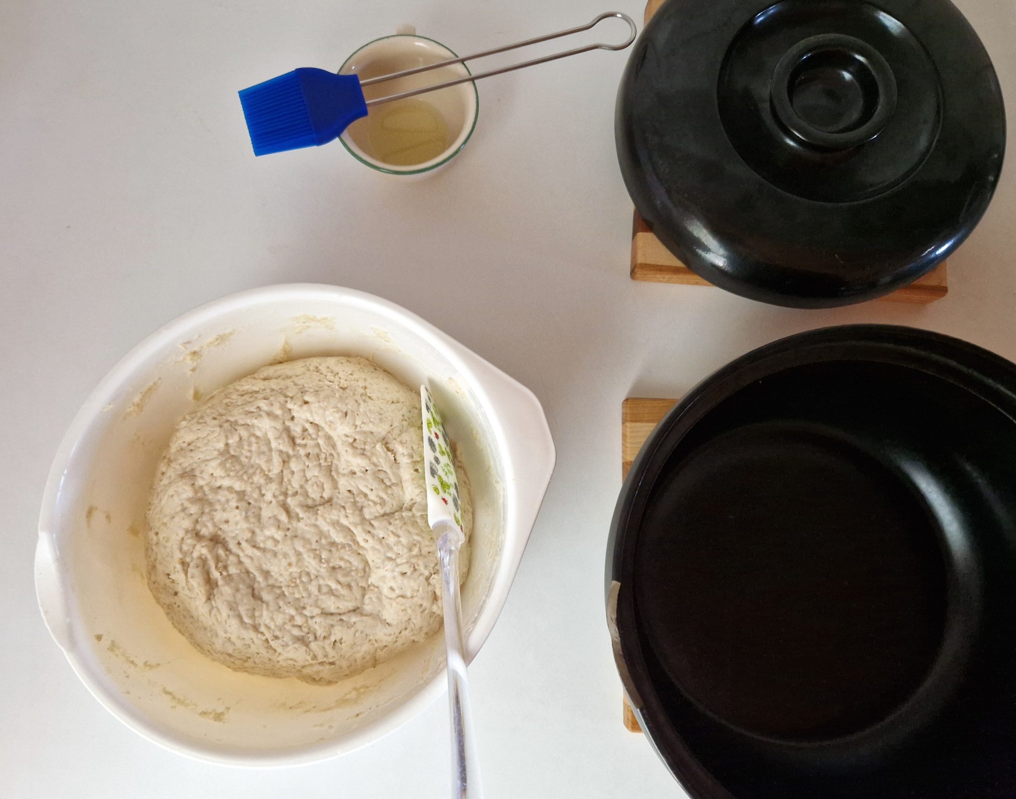 Kun uuni on valmis, ota pata pois uunista. Varo polttamatta itseäsi. Sivele öljyllä padan pohja ja alareunat kuumuutta kestävällä pullasudilla.