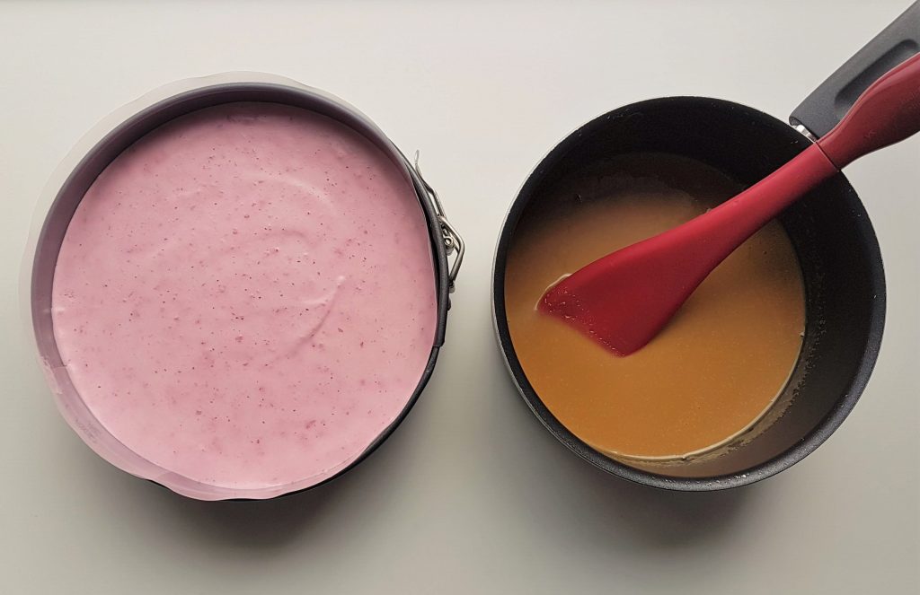 Kinuskikerroksen tekeminen oli tosi helppoa. Kiehautin kerman ja fariinisokerin kattilassa ja keitin seosta pari minuuttia. Lisäsin kuumaan seokseen ripauksen suolaa syventämään kinuskin makua sekä vedessä pehmenneet liivatelehdet. Jäähdytin kinuskiseoksen kädenlämpöiseksi ennen kuin kaadoin sen hyytyneen juustokakun päälle. Tämä kinuski leikkautuu kauniisti ja onnistuu aina.