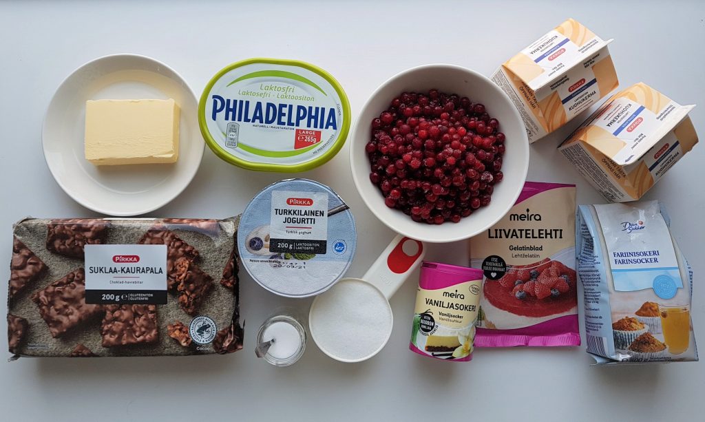 Puolukka-kinuskijuustokakun pohjaan testasin Pirkan gluteenittomia suklaa-kaurapaloja. Kaupasta löytyy myös Pirkan suklaa-riisipaloja, joista tulee mieleen lapsuuden herkku, riisisuklaa. Jauhoin suklaa-kaurapalat monitoimikoneella karkeaksi muruksi. Aika kovia olivat, kovempia kuin riisipalat. Voit tehdä kakkupohjan kummasta tahansa tai käyttää muita gluteenittomia keksejä. Pirkan kyseiset gluteenittomat tuotteet ovat hinnaltaan varsin edullisia verrattuna gluteenittomiin kekseihin. Muruseoksena niiden maku on minusta enemmän kuin kohdallaan. Suosittelen kokeilemaan.