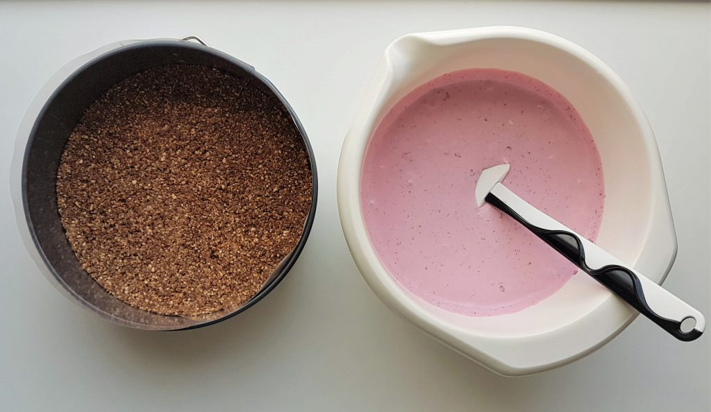 Perusaineiden lisäksi laitoin täytteeseen turkkilaista jogurttia keventämään ja raikastamaan makua. Tein kakun pakastepuolukoita, jotka jauhoin jäisinä karkeaksi rouheeksi. Tuoreista tämä onnistuu yhtä hyvin.
