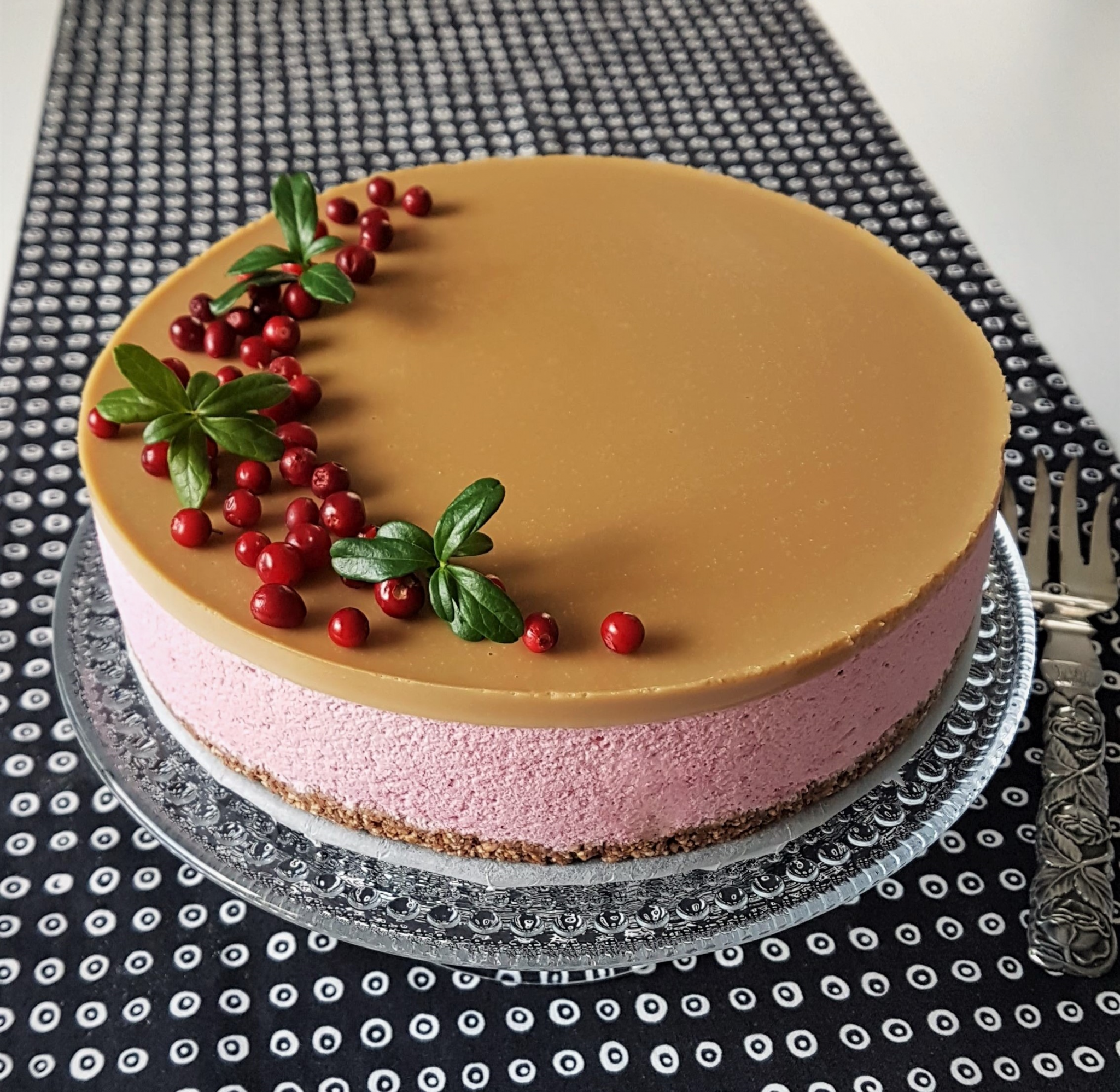 Herkuttelevat herrat kokoontuivat perinteiseen tapaamiseensa viime viikonloppuna. Minulla on ollut tapana leipoa joku kakku paremman puoliskoni matkaan. Tänä vuonna ei tarvinnut pitkään pohtia, mikä olisi tämän vuoden juttu. Puolukka-aika menossa, joten jotain uutta ihanaa puolukasta. Pari vuotta sitten leivoin jouluksi vegaanisen ja gluteenittoman puolukka-valkosuklaajuustokakun. Nyt halusin tehdä pelkästään gluteenittoman puolukkajuustokakun, jonka kruunaan kinuskipäällysteellä.