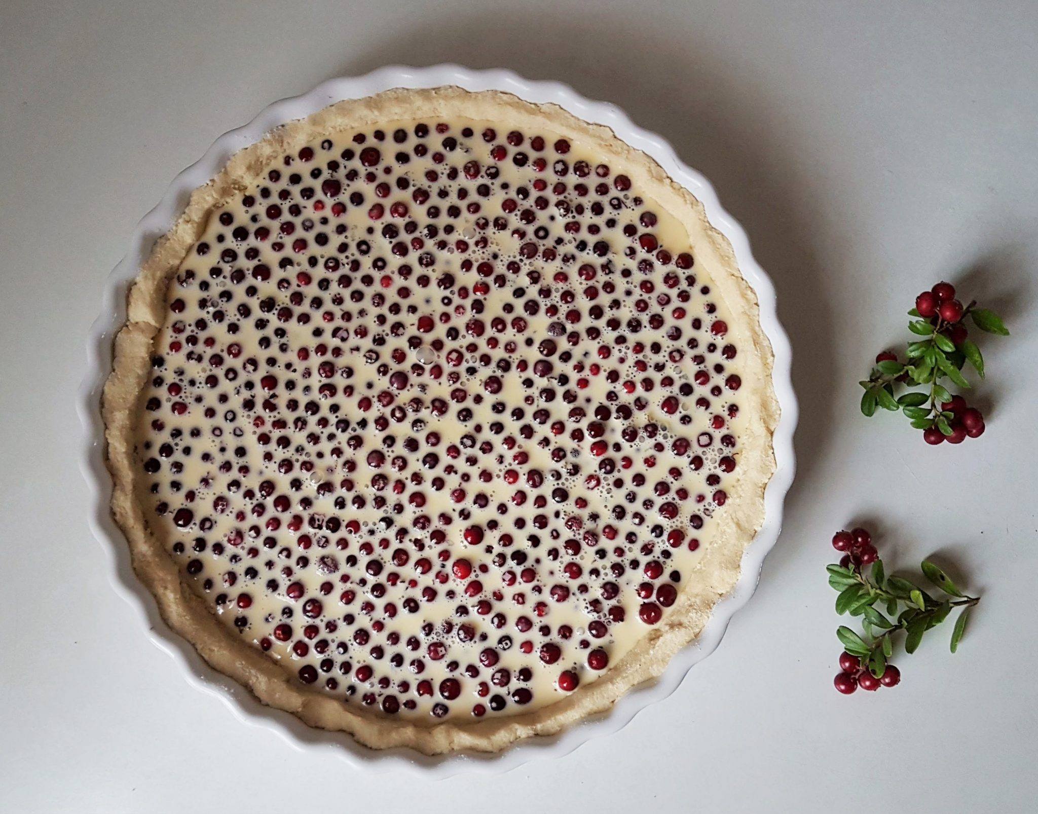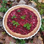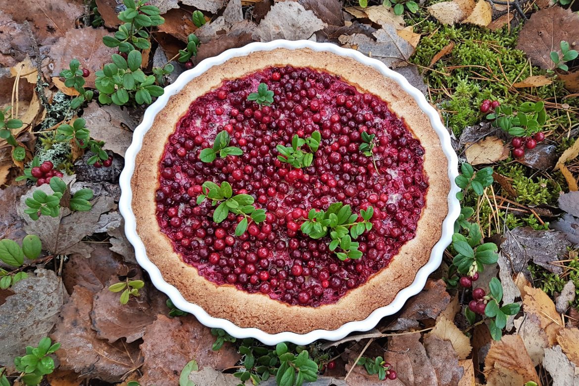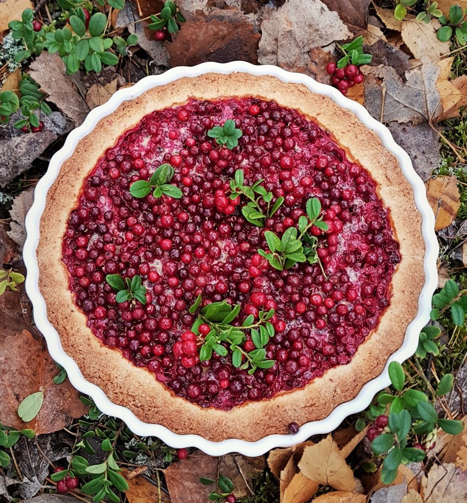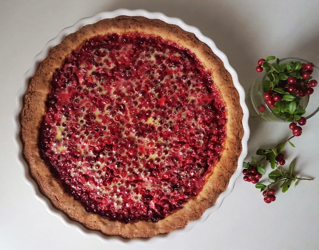 Kypsän piirakan päälle kannattaa laittaa vähän puolukoita koristeeksi. Puolukka on siitä hyvä marja, että pakastettunakin se on kaunis ja säilyttää hyvin muotonsa.