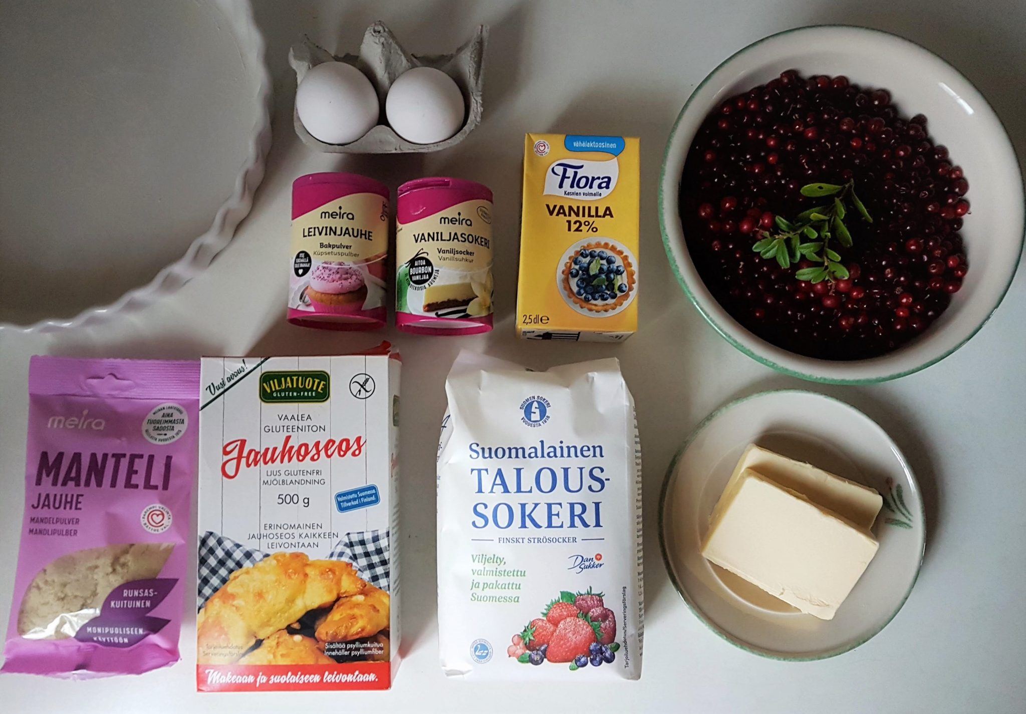 Gluteenittoman puolukkapiirakan pohjassa käytin mantelijauhetta ja tattaripohjaista gluteenitonta jauhoseosta. Täytteeseen laitoin purkillisen vaniljakastiketta, joka oli jäänyt käyttämättömänä pyörimään jääkaappiin. Voit laittaa myös kermaviiliä vaniljakastikkeen asemasta. Lisää silloin hieman sokeria. Vaniljakastikkeessa kun on jo itsessään sokeria.