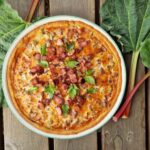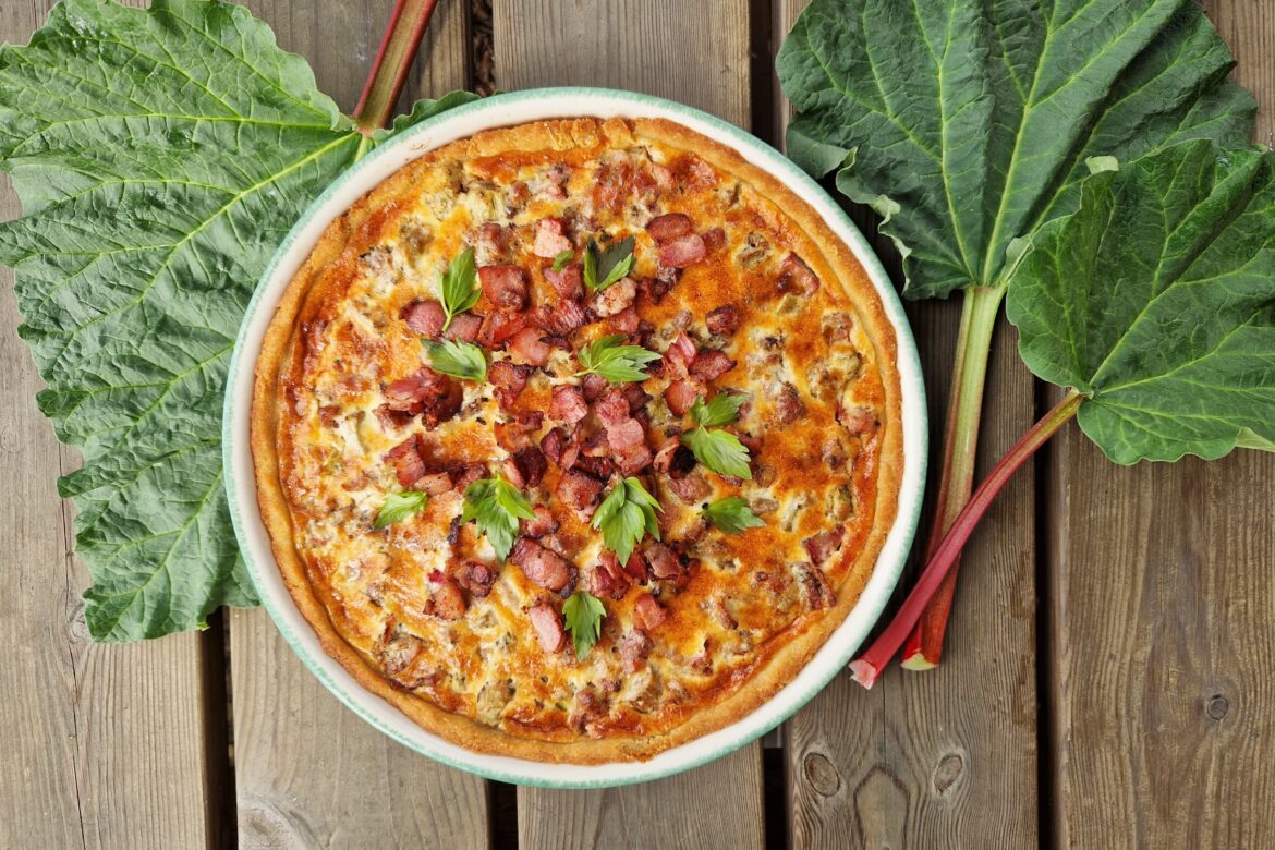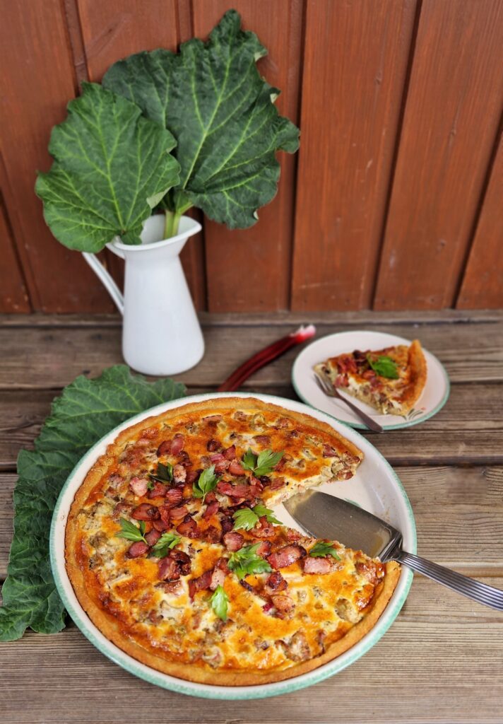 Paista raparperi-pekonipiirakkaa noin 20 minuuttia tai kunnes piirakka saa kauniin värin.