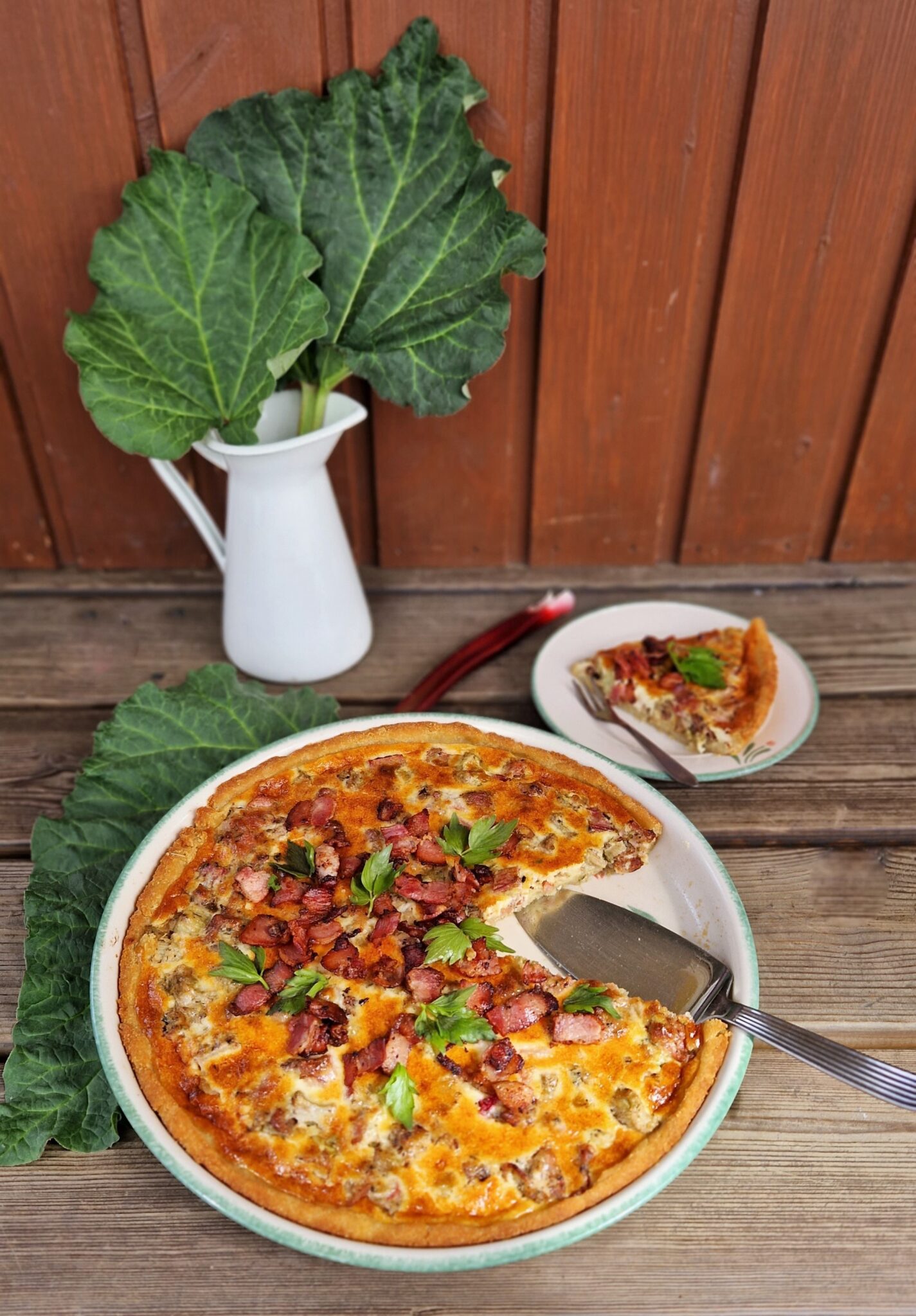 Maistoimme raparperi-pekonipiirakkaa heti uunista ottamisen ja kuvausten jälkeen. Mieheni odotti vesi kielellä, milloin saan kuvaukset tehtyä. Parin santsipalan jälkeen piirakka piti napata sivuun, jotta serkullekin riittää maistiaisia. Olipa tosiaan herkullisen makuista. Kirpeä raparperi sopii mainiosti rasvaisen pekonin kaveriksi. Täydellinen liitto. Kiitos Hilkka loistavasta leivontavinkistä!