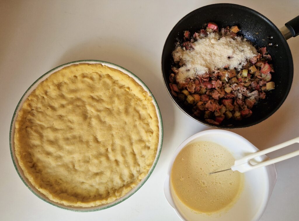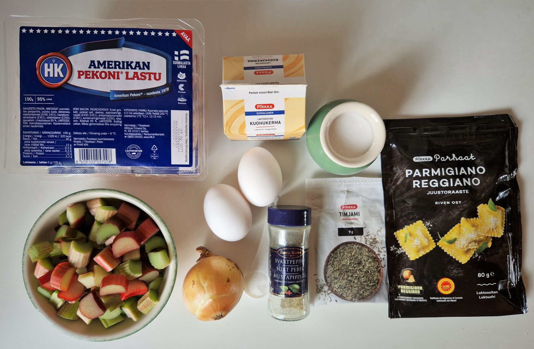 Pekonilastut ja sipuli ruskistetaan pannulla, seos maustetaan ja lopuksi lisätään raparperit. Parmesaanijuustosta laitoin puolet täyteaineiden joukkoon ja puolet munakermaseokseen. Pekoni on rasvaista, joten voit vaihtaa halutessasi kuohukerman maitoon. Ja yhdelläkin pekonirasialla pärjäät, jos piirakan päälle et laita ruskistettua pekonimurua.