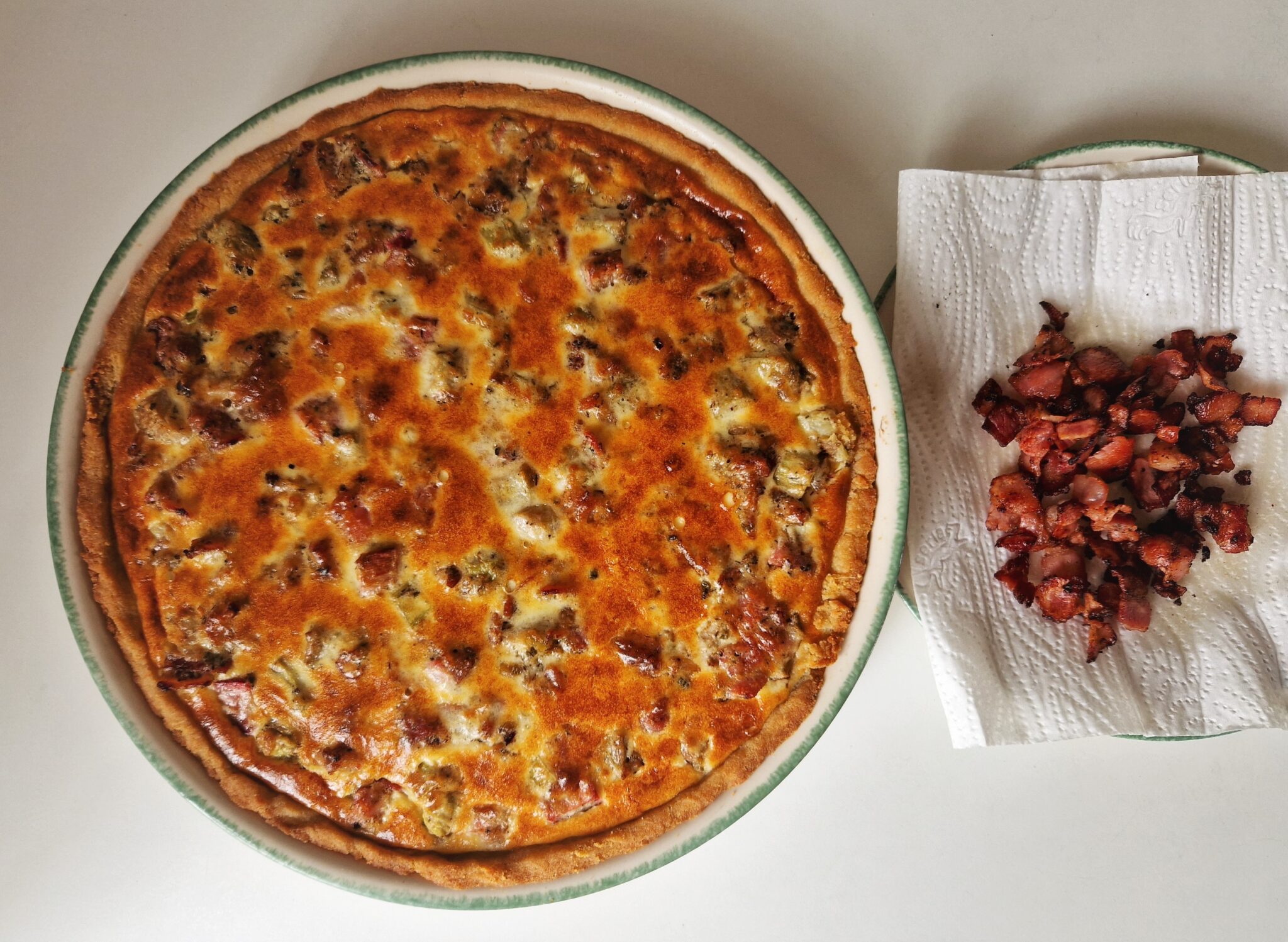 Kypsän piirakan pinnalle tehdään vielä pekonimuruseos. Pekonilastut on hyvä nostaa ruskistamisen jälkeen talouspaperin päälle. Tällöin ylimääräinen rasva valuu pois.