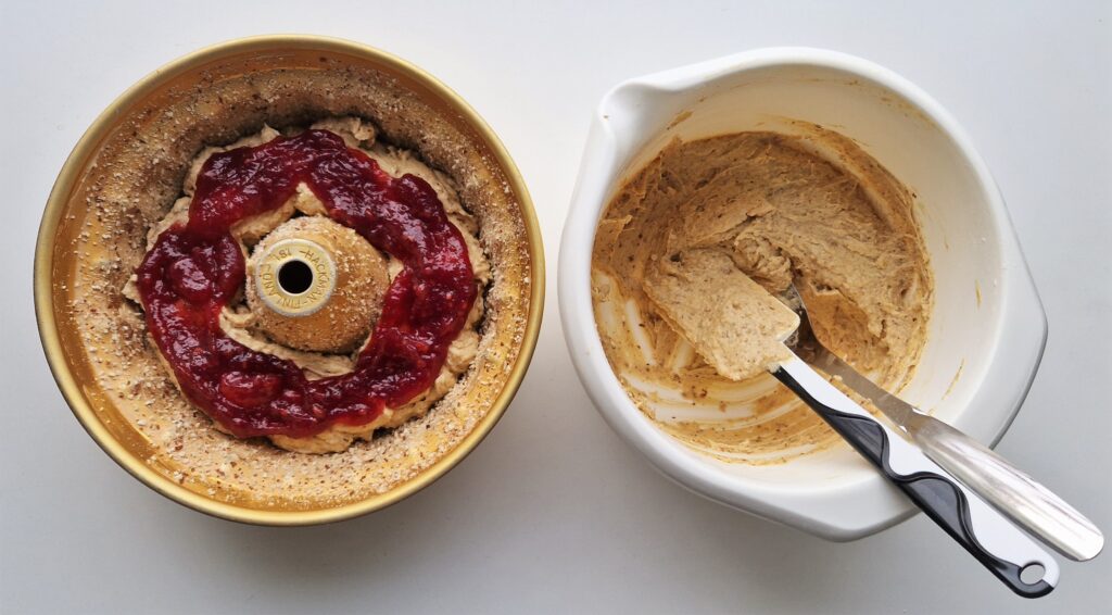 Nosta reilu kolmannes taikinasta lusikalla kakkuvuokaan. Laita päälle marmeladia raidaksi. Nosta lopputaikina päälle ja tasoita kakun pinta.