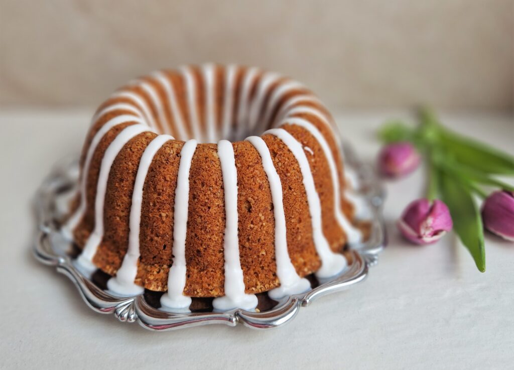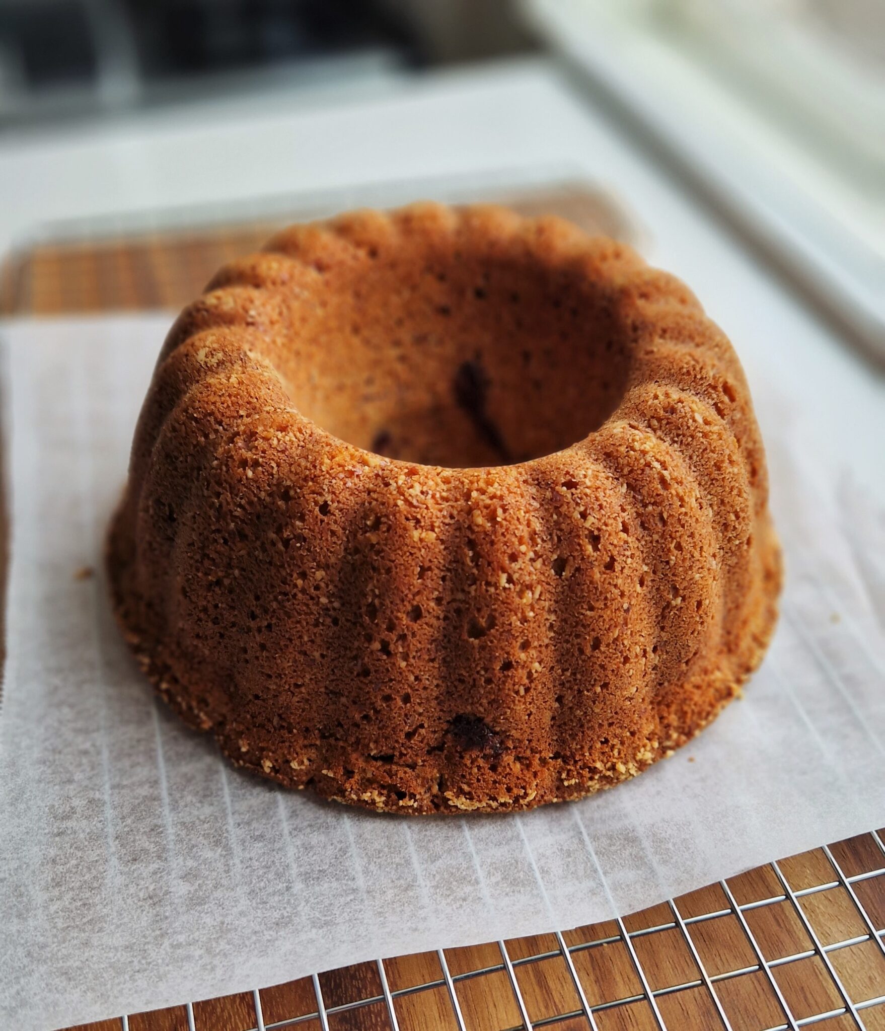 Paista kakkua uunissa noin 50 minuuttia. Anna kakun vetäytyä vuoassa 5–10 minuuttia ja kumoa sitten kakku ritilän päälle jäähtymään.
