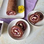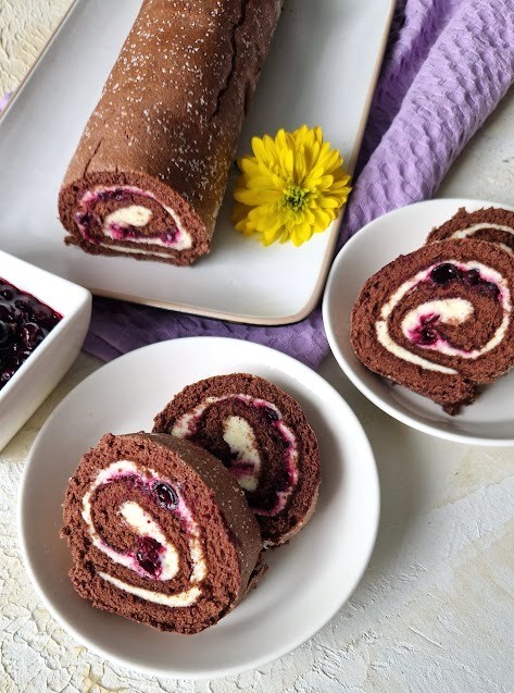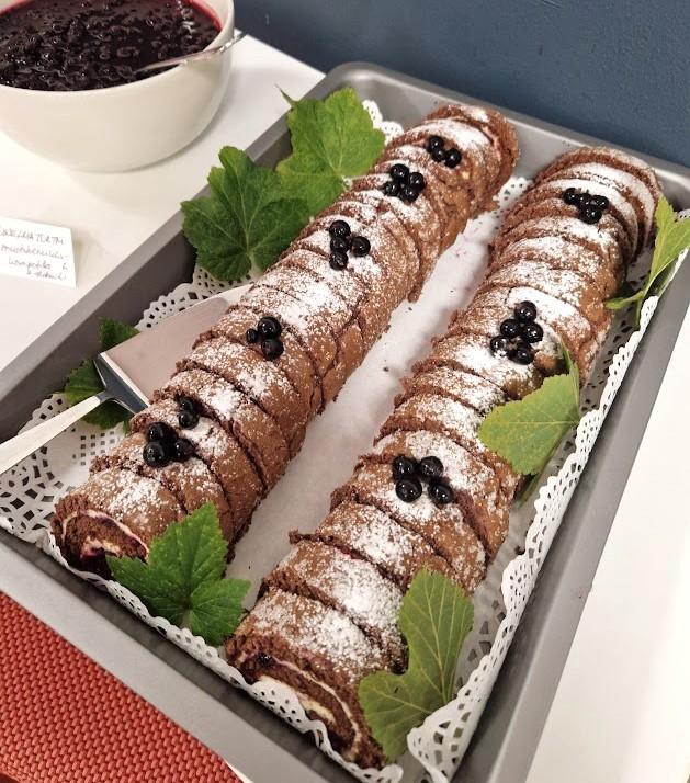 Leikkaa kääretorttu viipaleiksi ja tarjoa mustaherukkakompotin kanssa.