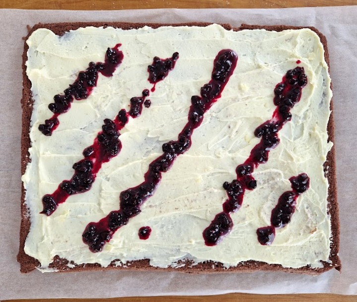 Levitä voikreemi jäähtyneelle kääretorttulevylle. Jos käytät herukkakompottia täytteessä, valuta noin 1 dl raidoiksi kreemin päälle.