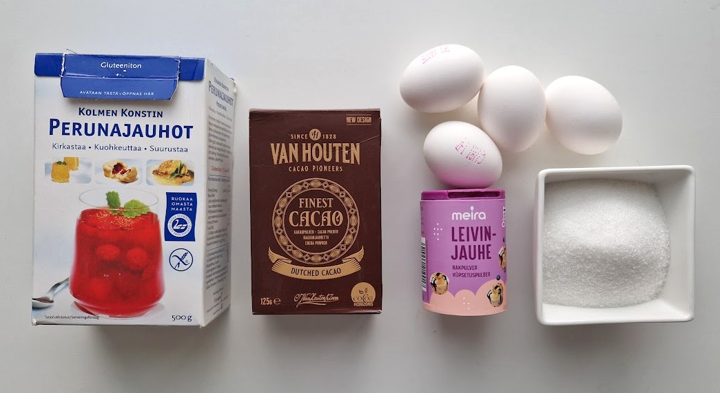 Valmista kääretorttupohja. Sekoita perunajauho, kaakaojauhe ja leivinjauhe keskenään. Vatkaa huoneenlämpöiset kananmunat ja sokeri tukevaksi vaahdoksi. Siivilöi kuivat aineet vähän kerrallaan muna-sokerivaahtoon kevyesti käännellen, esimerkiksi nuolijalla.