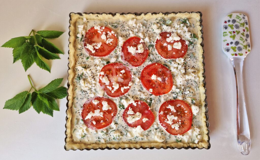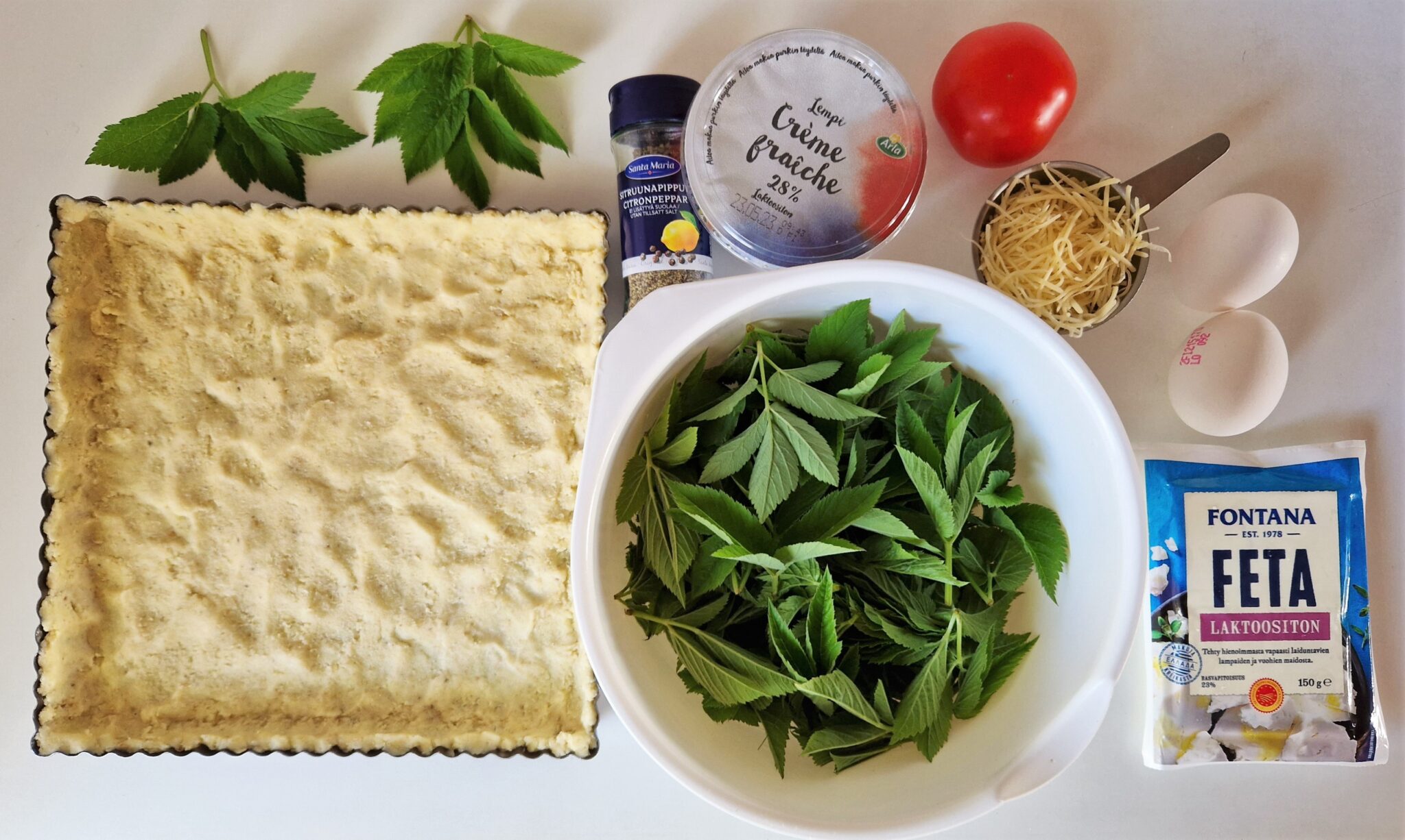 Täytettä varten vuohenputken lehdet huuhdotaan, kuivataan talouspaperilla/keittiöpyyhkeellä ja hienonnetaan. Fetajuuston tilalla voit käyttää myös vuohenjuustoa. Vuohenputki tykkää myös tomaatista.