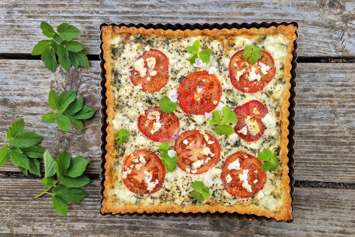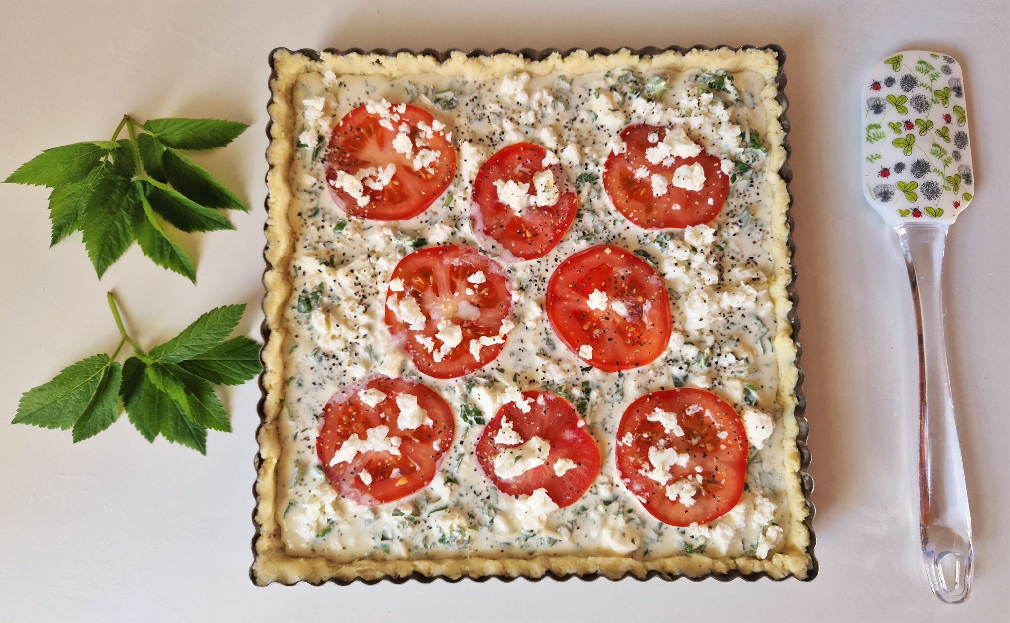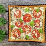 Kaada täyte piirakkapohjan päälle. Asettele tomaattiviipaleet täytteen päälle ja murustele loput fetajuustosta pinnalle.