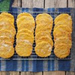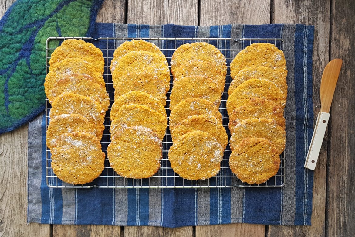 Tein tupla-annoksen taikinaa, jotta sain samalla tehtyä rieskoja pakkaseen etätyöpäivien välipaloiksi. Pakastetut bataattirieskat kannattaa lämmittää leivänpaahtimessa. Muistathan käyttää paahtopussia paahtimessa kontaminaation ehkäisemiseksi, mikäli leivänpaahtimessa paahdetaan myös gluteenipitoisia tuotteita.