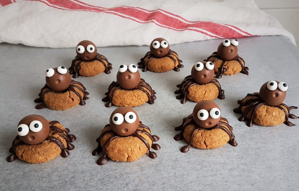 Gluteenittomat hämähäkki-maapähkinäkeksit voi tehdä valmiiksi jo hyvissä ajoin ennen juhlia.