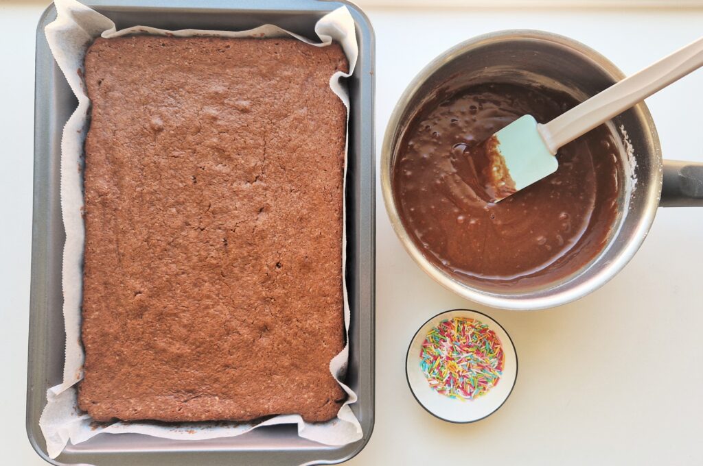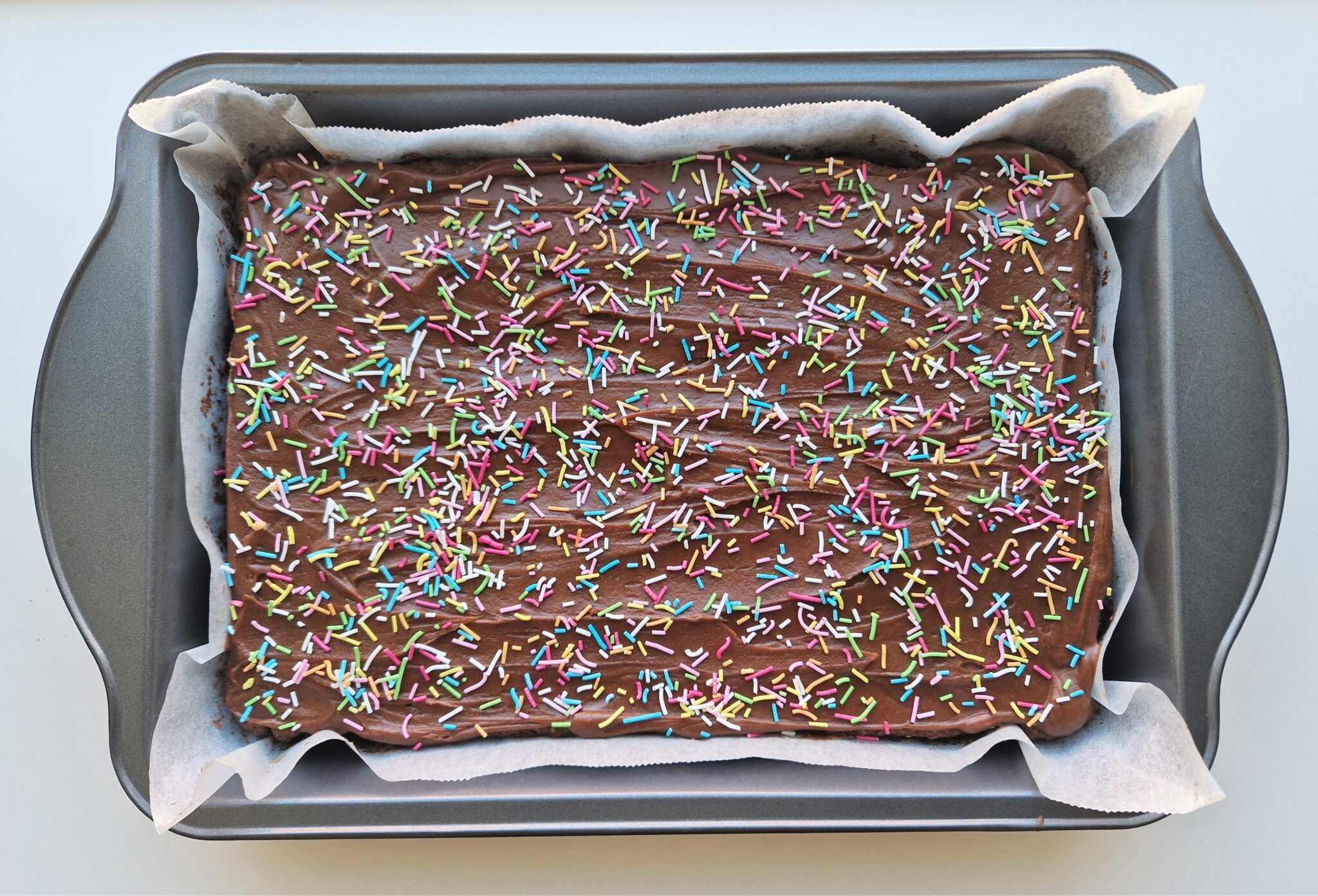Levitä kuorrutus pohjan päälle. Ripottele strösselit heti pinnalle, jotta ne tarttuvat kiinni kuorrutukseen.