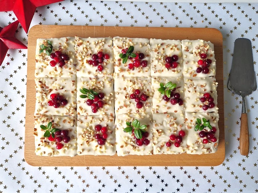 Leikkaa levy paloiksi. Koristele palat karpaloilla tai puolukoilla sekä tuoreilla yrteillä.