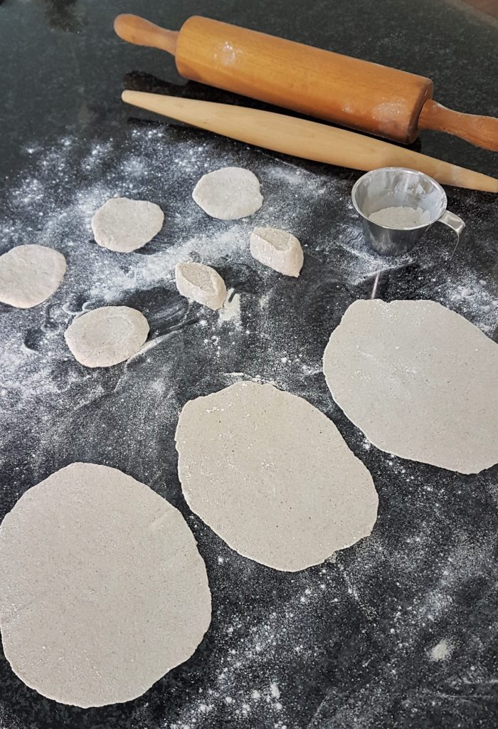 Kaulitse kakkarat piirakkapulikalla tai kaulimella ohuiksi soikeiksi kuoriksi. Käytä kaulimiseen reilusti tattarijauhoja pöytään tarttumisen estämiseksi.