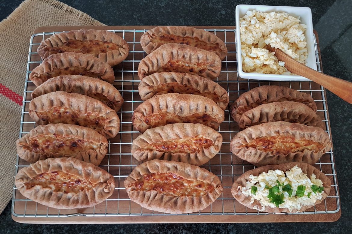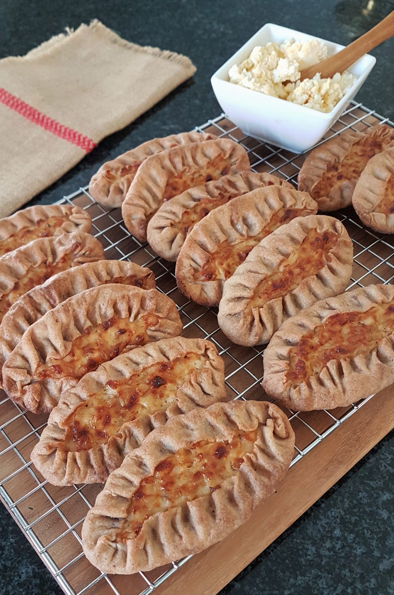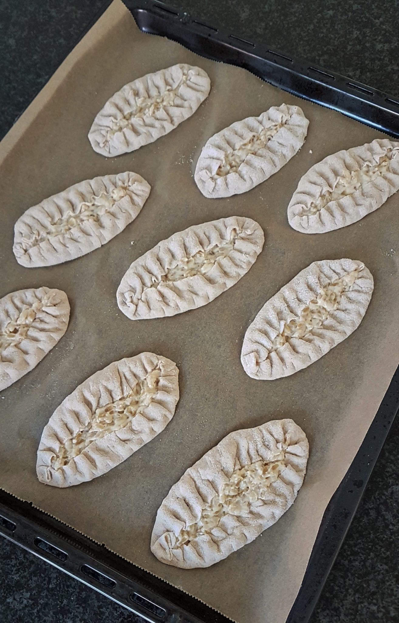Rypytä piirakan reunat puuron päälle etusormilla molemmilta laidoilta yhtä aikaa. Nosta piirakat uunipellille leivinpaperin päälle.