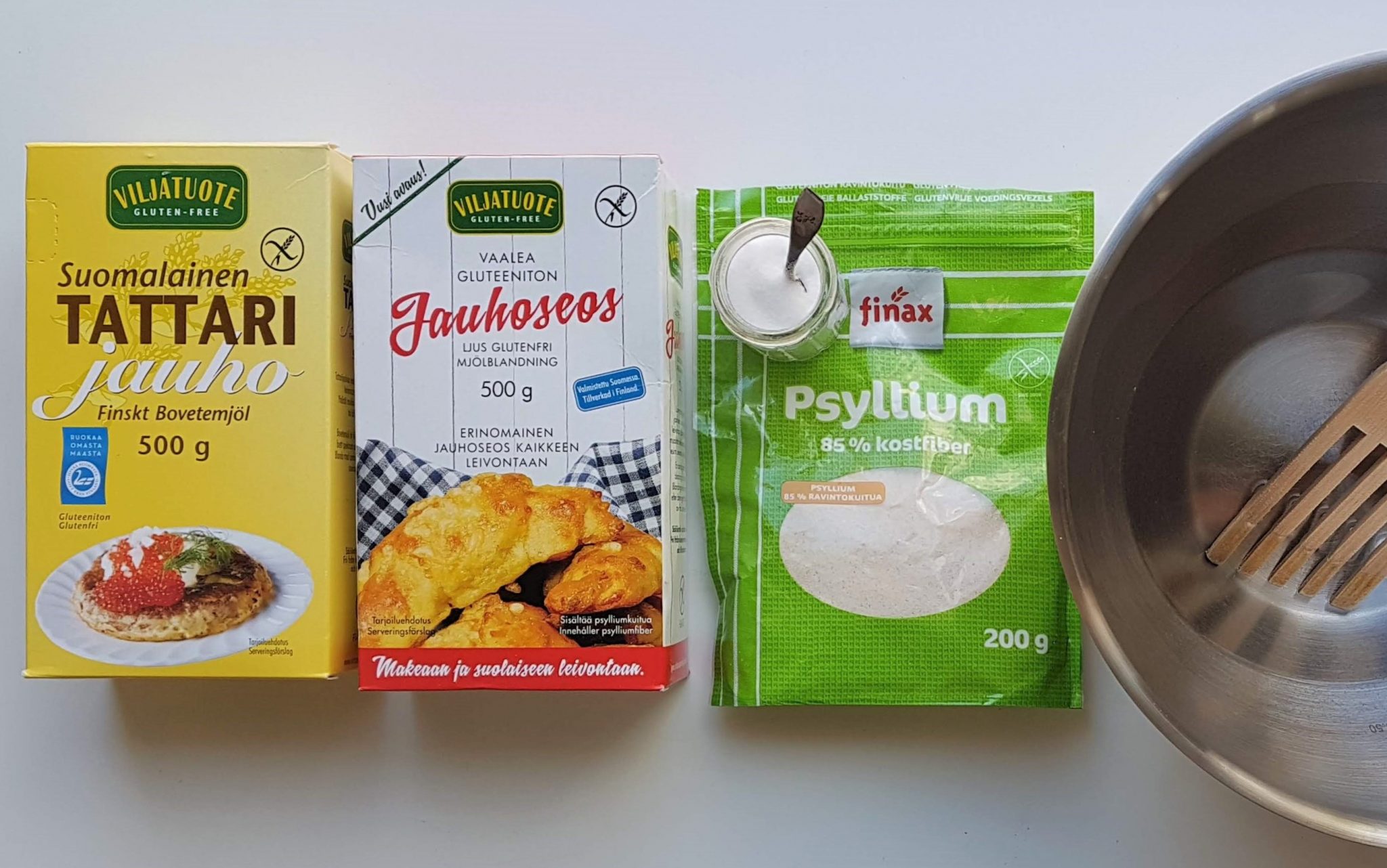 Valmista kuoritaikina puuron keittämisen ohessa. Sekoita kylmään veteen psyllium ja suola. Anna seoksen turvota noin 5 minuuttia. Lisää jauhot pienissä erissä koko ajan sekoittaen. Käytä alussa vispilää, jotta mahdolliset paakut rikkoontuvat. Taikina on valmis, kun se irtoaa kulhon reunoista ja on pehmeää.