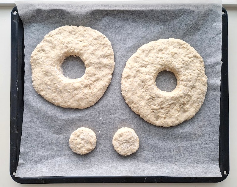 Kaada hieman kohonnut taikina jauhotetulle työpöydälle ja jaa se kahteen palaan. Muotoile palat litteiksi pyöreiksi leiviksi leivinpaperoidulle uunipellille. Ota pienellä lasipurkin suulla tai pienellä pyöreällä muotilla pala pois keskeltä, jotta saat muodostettua reikäleivät. Voit tehdä tämän myös käsin.