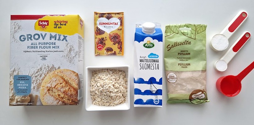 Gluteenittomiin kaurareikäleipiin käytin Schärin (aiemmin Semper) karkeaa gluteenitonta jauhoseosta ja Kotimaista-brändin gluteenittomia kaurahiutaleita. Nesteeksi laitoin maitoa, mutta yhtä hyvin voit käyttää vettä tai kasvimaitoa.