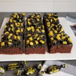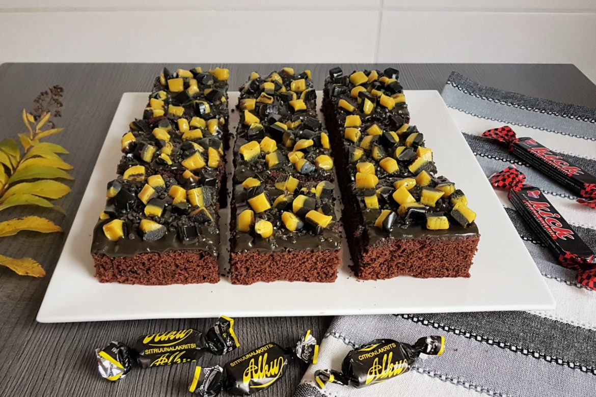 Koristele mokkapalat paloiksi leikatuilla sitruunalakritsikaramelleilla ja turkinpippurirouheella. Leikkaa levy paloiksi kun kuorrutus on jähmettynyt.