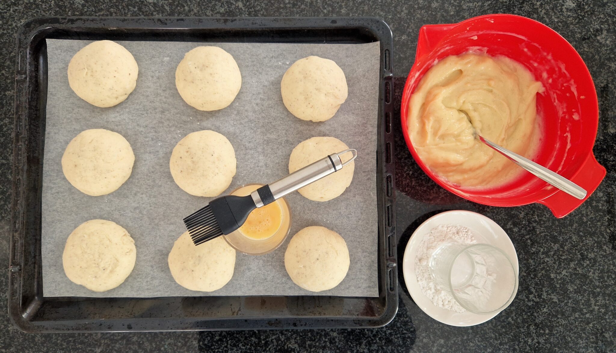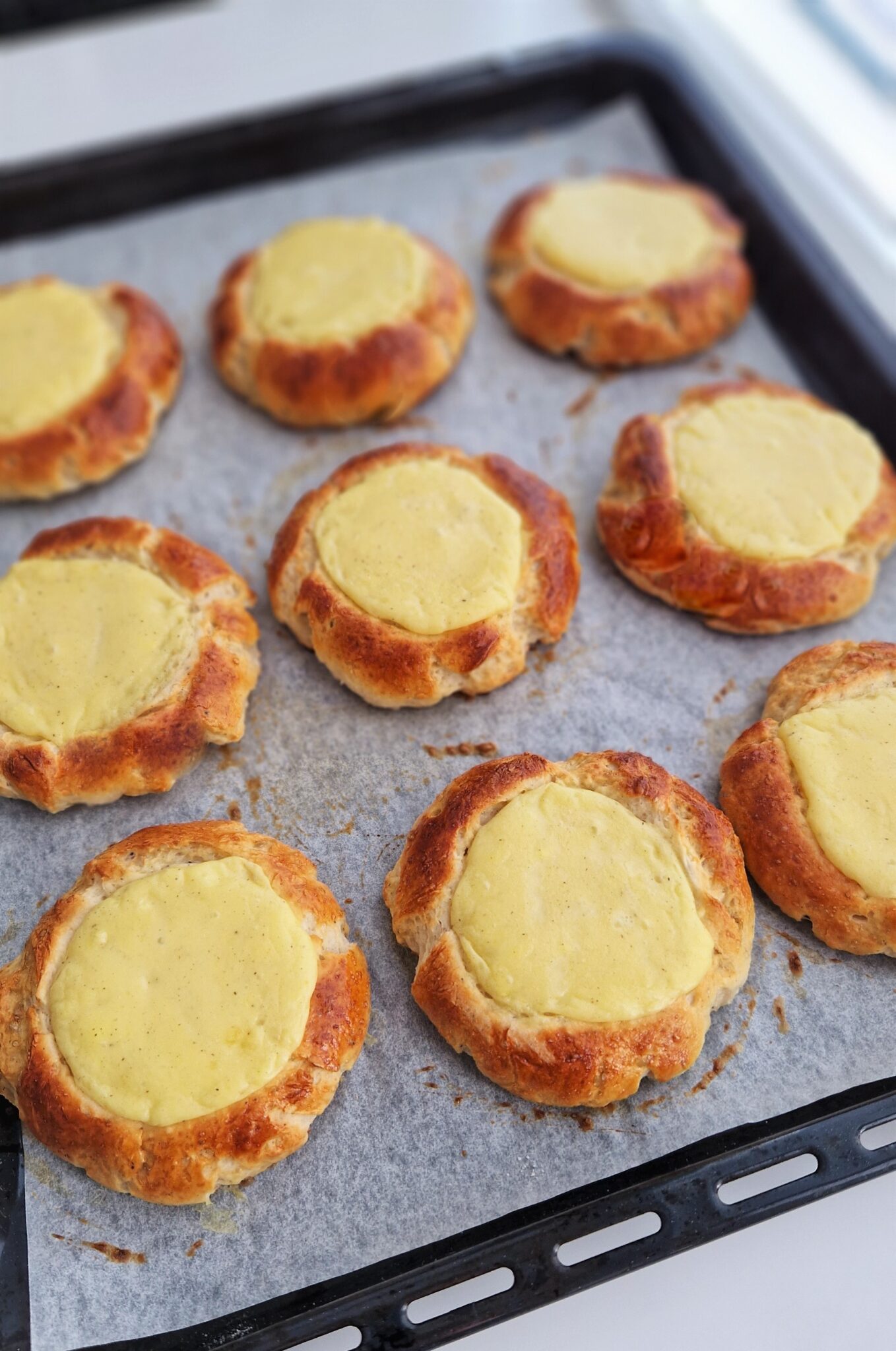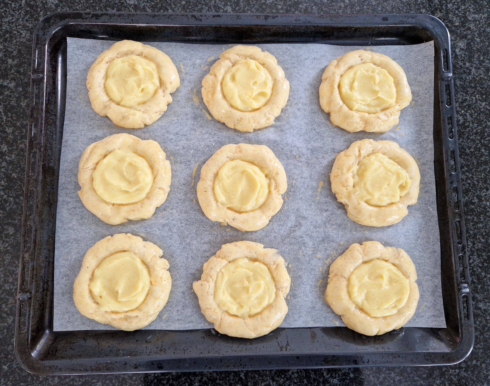 Kohoamisen aikana tehdään vaniljatäyte. Vaniljakreemijauhe sekoitetaan maitoon ja siirretään jääkaappiin tekeytymään. Itse jouduin lisäämään maitoa enemmän kuin pakkauksessa mainittiin. Kohonneisiin pulliin painetaan juomalasilla kolot. Tämän jälkeen pullien reunat voidellaan kananmunalla ja viimeiseksi kolot täytetään vaniljakreemillä.
