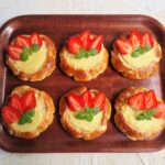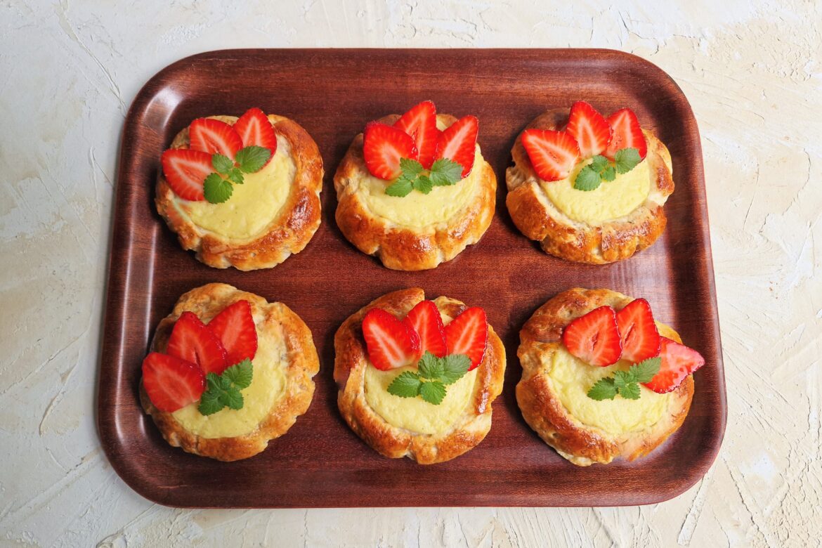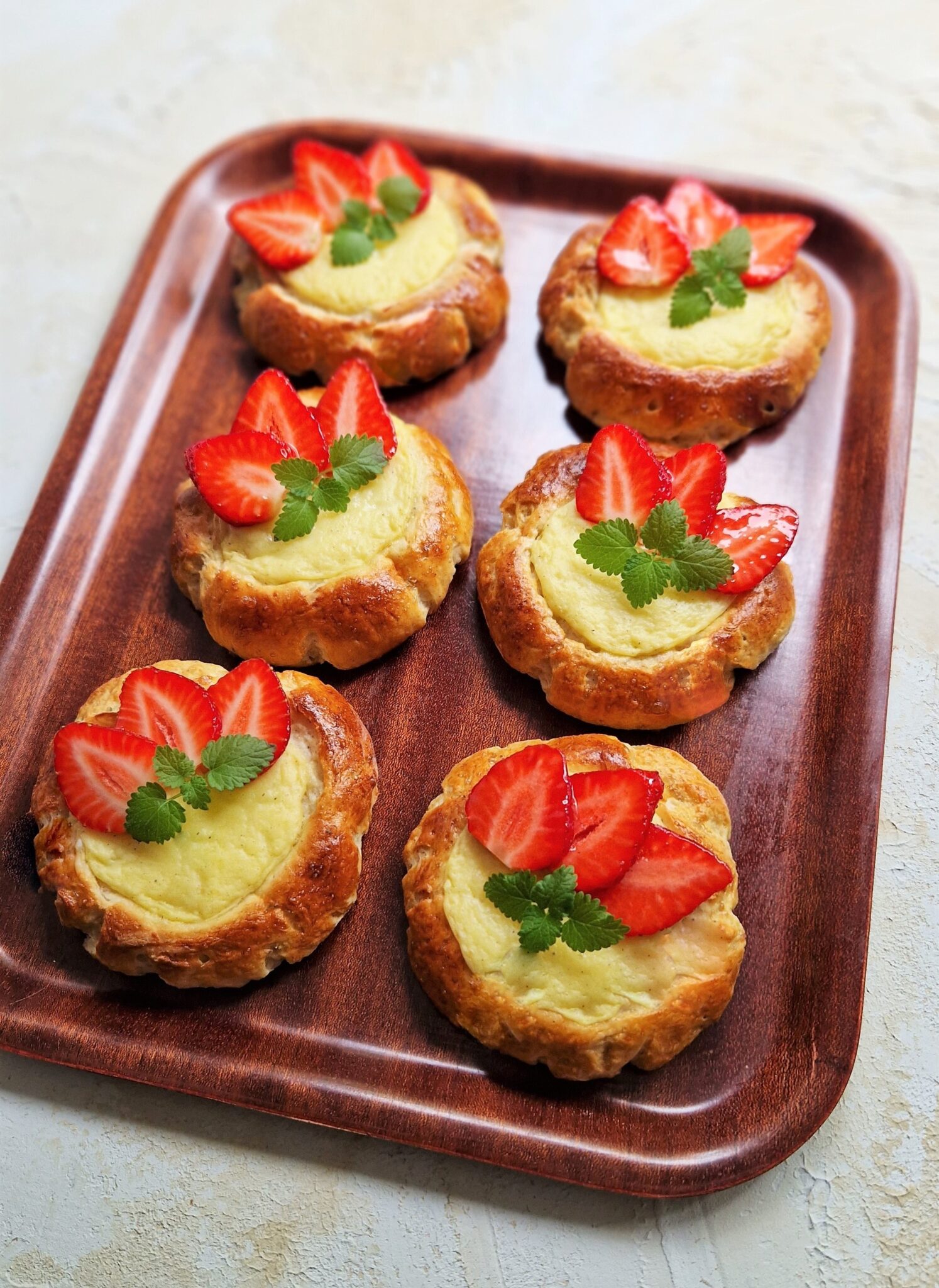 Paistamisen jälkeen pullien annetaan jäähtyä ennen mansikkaviipaleiden lisäämistä päälle. Vaikka pullat vähän repeilivät koloja painettaessa, ei se makuun vaikuttanut. Mansikka-vaniljapullista tuli tosi makoisia. Jos haluat vielä viimeistellä pullat, voit sivellä hyytelösokerista tehtyä kiillettä mansikkaviipaleille.