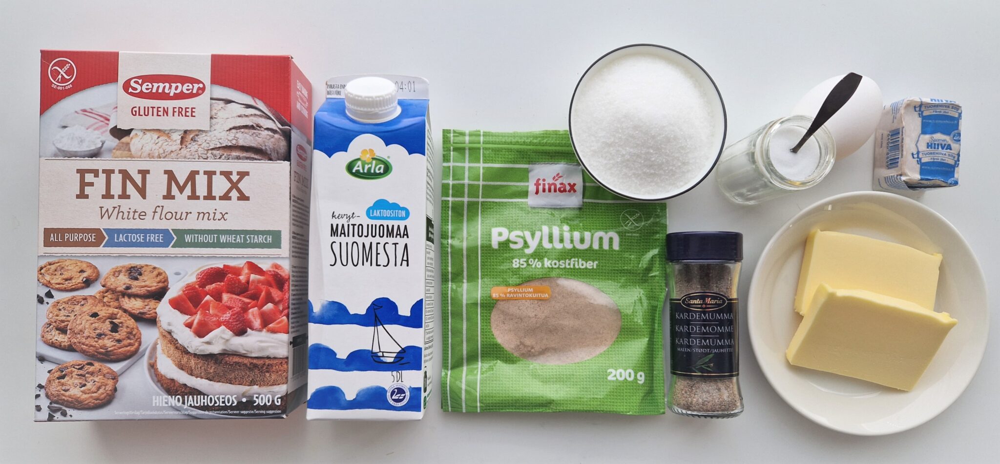 Lämmintä maito kädenlämpöiseksi ja liuota hiiva joukkoon. Lisää psyllium ja sekoita hyvin. Anna psylliumin turvota 10 minuuttia. Lisää suola, sokeri, kardemumma ja kananmuna. Lisää jauhoseos pienissä erissä ja lopuksi pehmeä voi. Vaivaa taikinaa 5–7 minuuttia sähkövatkaimen taikinakoukuilla. Anna valmiin taikinan tekeytyä noin kymmenkunta minuuttia.