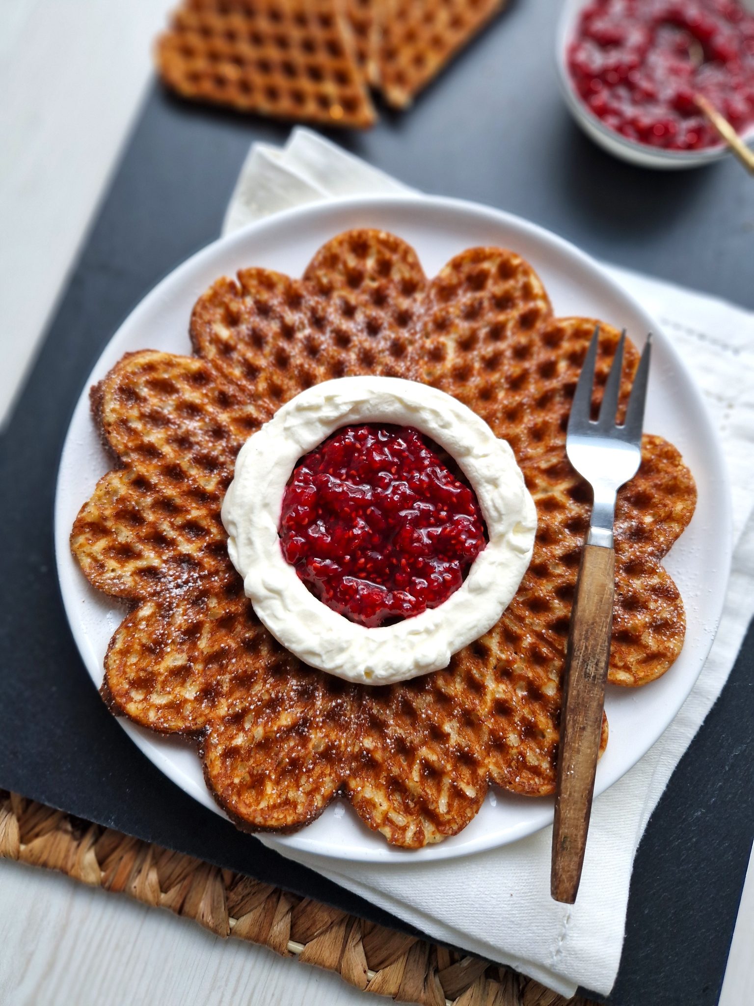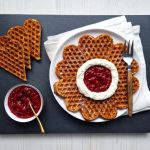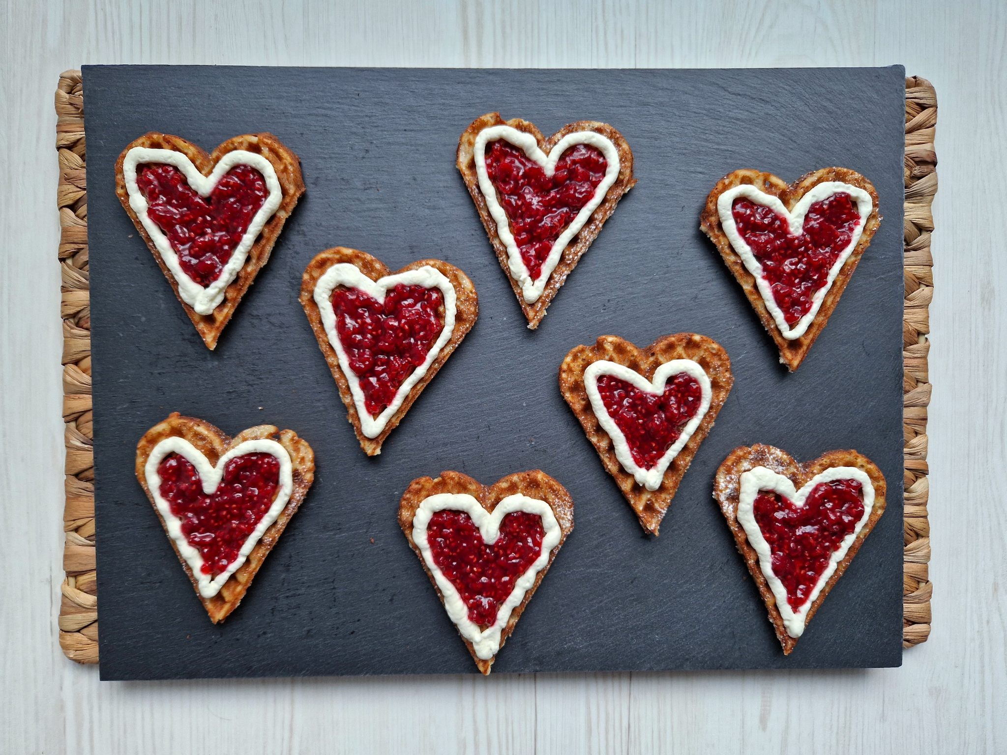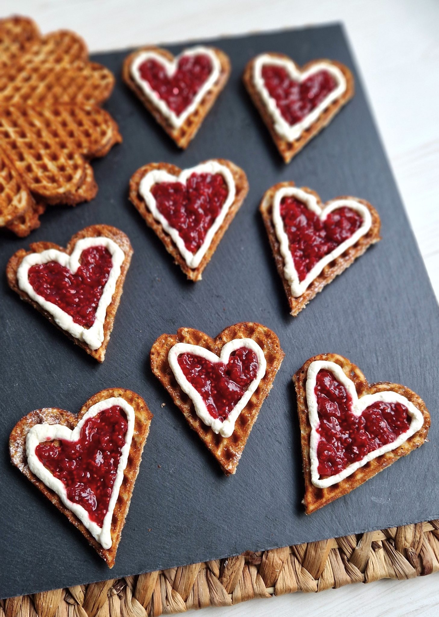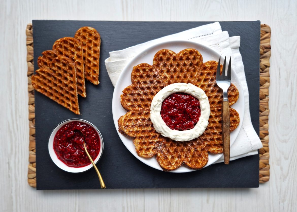 Voit myös tehdä pieniä sydämenmuotoisia vohvelileivoksia hillon ja kermavaahdon kera.