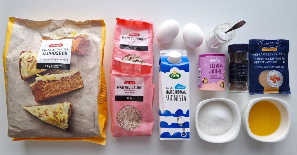 Sulata voi ja anna jäähtyä. Vatkaa munat ja sokeri kevyeksi vaahdoksi. Lisää joukkoon maito ja jäähtynyt voisula. Sekoita gluteenittomaan jauhoseokseen leivinjauhe sekä mantelijauhe ja -rouhe, ja mausteet. Lisää seos taikinaan muutamassa erässä.