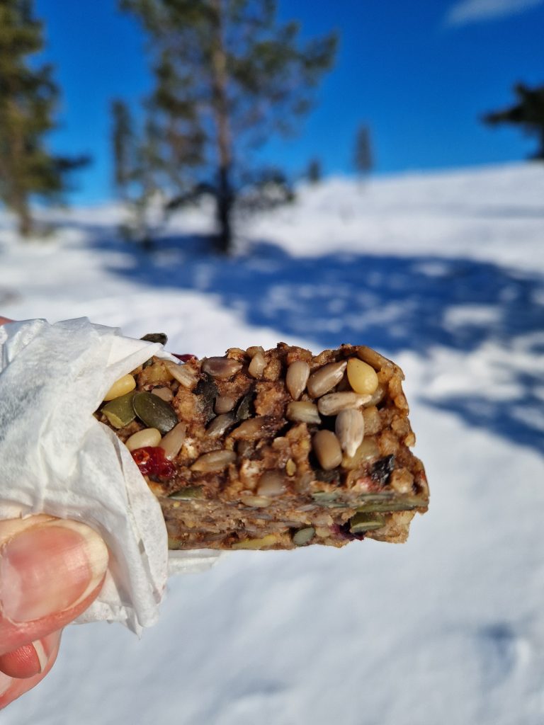 Viime viikolla olin ystävien vieraana Lapissa. Lähes joka päivä noustiin lumikengillä tai jalkaisin tuntureiden ja vaarojen päälle. Oli ihanan rentouttavaa viipyillä lumisissa maisemissa, tutkailla luonnon ihmeitä sekä nauttia hyvästä seurasta ja makoisista retkieväistä. Tuliaisiksi Lappiin vein gluteenittomia siemenpatukoita.