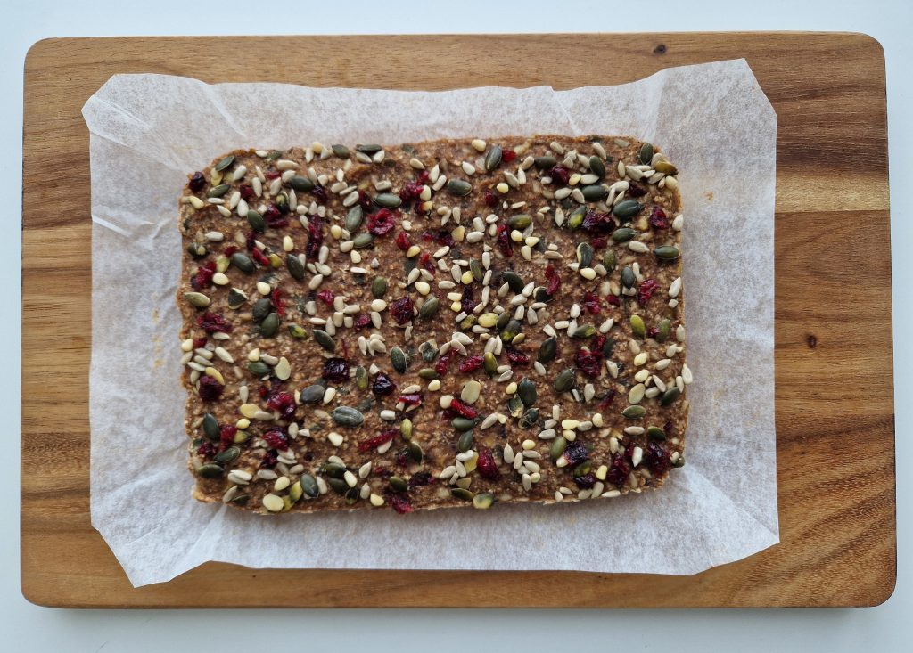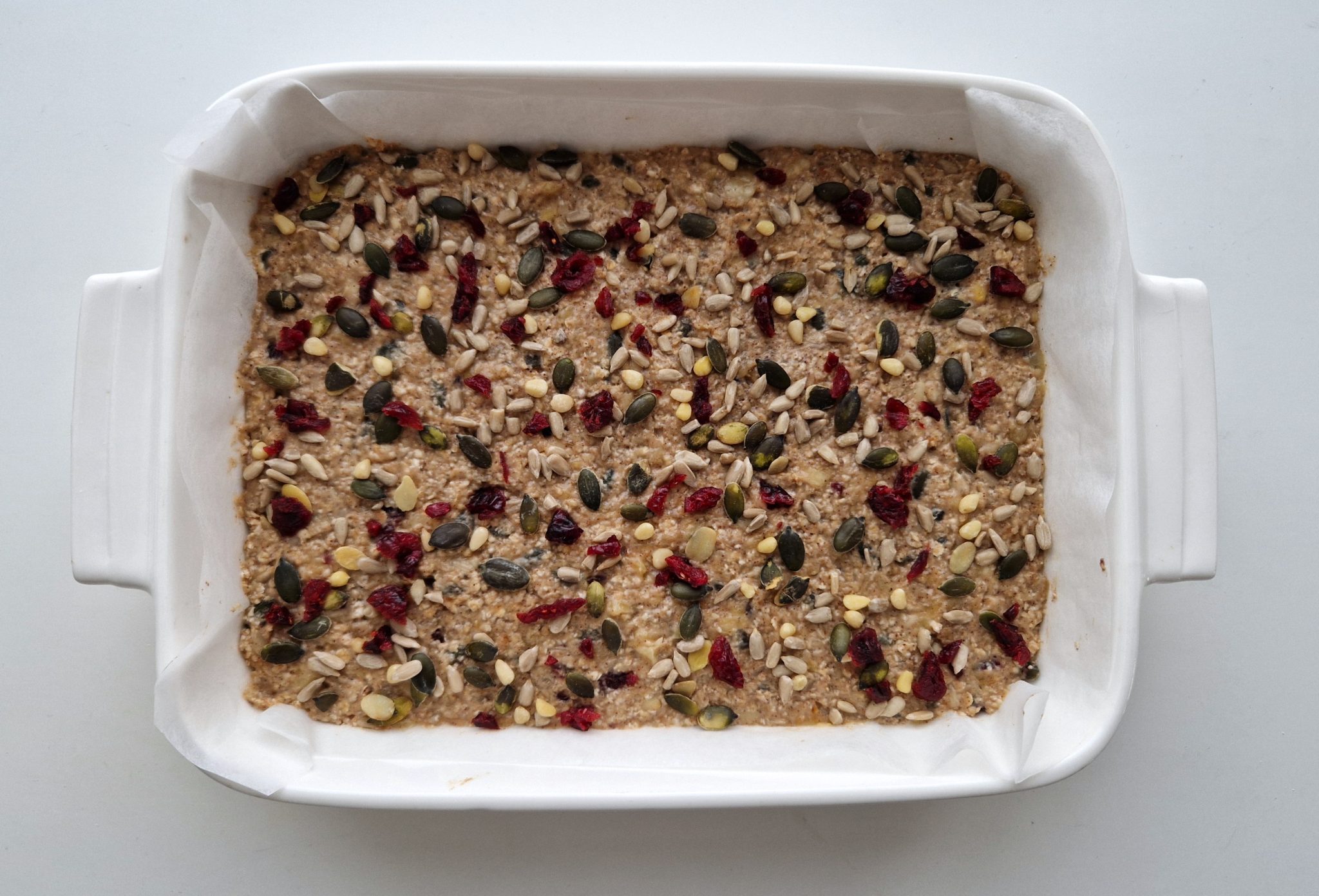 Painele ruokalusikalla seos pienen uunivuoan pohjalle tiiviiksi levyksi. Ripottele pinnalle salaattisiemensekoitusta ja pilkottuja karpaloita ja painele ne kiinni seokseen.