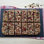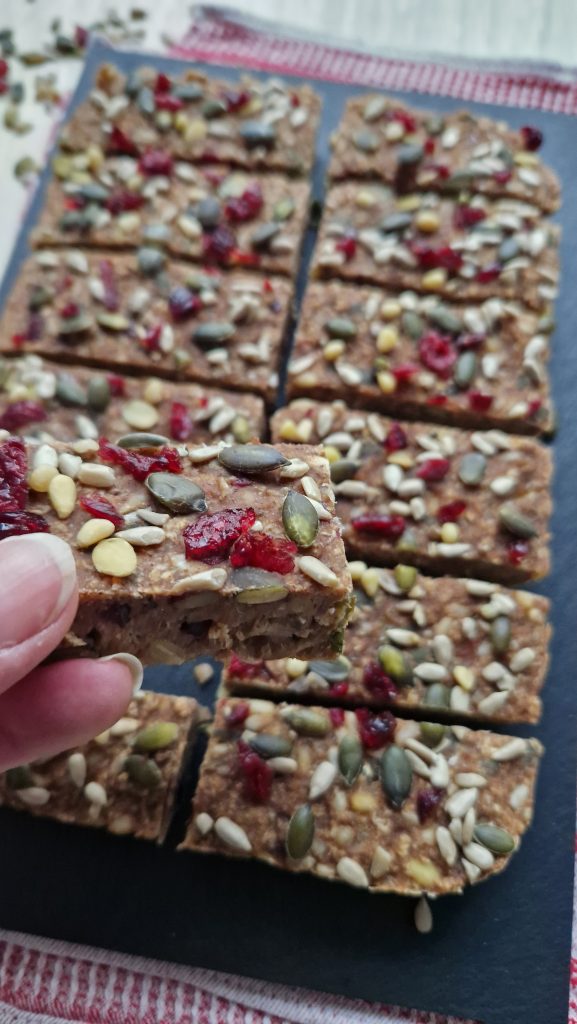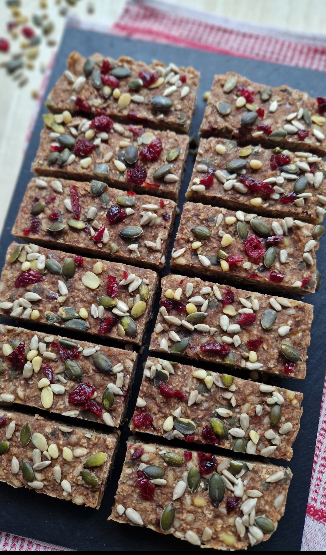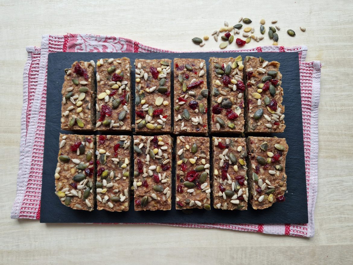 Nämä välipalapatukat ovat tosi helppoja ja nopeita tehdä. Banaanit muussataan ja muut aineet sekoitetaan joukkoon. Seos painellaan tiiviisti pieneen uunivuokaan, päälle ripotellaan salaattisiemensekoitusta ja karpaloita. Patukkalevyä paistetaan uunissa reilu parikymmentä minuuttia.