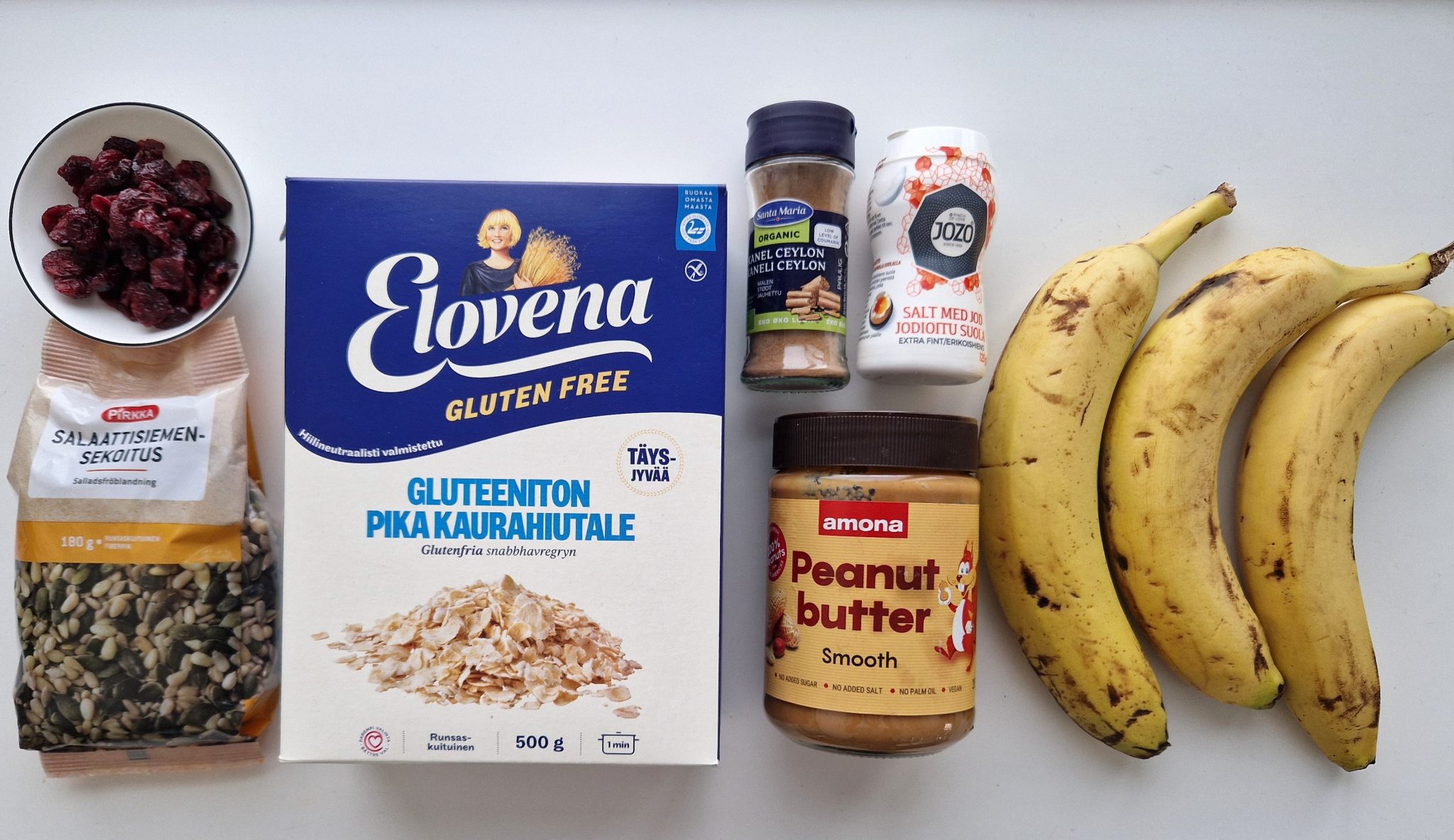 Gluteenittomiin välipalapatukoihin tulee salaattisiemensekoitusta ja gluteenittomia kaurahiutaleita. Makeus tulee banaaneista ja kuivatuista karpaloista. Kuivattuihin karpaloihin on valmistusvaiheessa lisätty sokeria, koska ne olisivat muutoin tosi kirpeitä. Halutessasi voit vaihtaa ne rusinoihin. Lisäksi olen laittanut vaihdellen joko maapähkinävoita tai rypsiöljyä sekä mausteeksi kanelia ja ripaus suolaa. Joskus laitan joukkoon ruokalusikallisen chiansiemeniä.