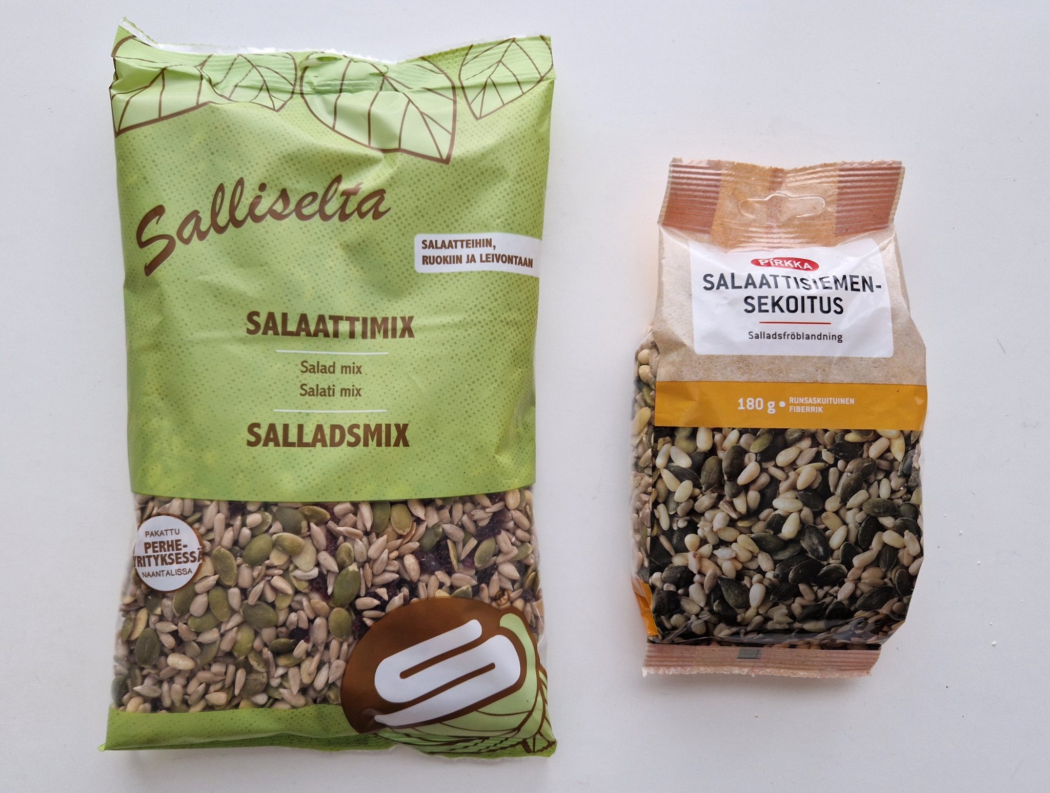 Valmiita salaattisiemenseokset ovat käteviä. Olen käyttänyt sekä Pirkan että Sallisen salaattisiemensekoitusta. Molemmissa on auringonkukansiemeniä, kurpitsansiemeniä ja pinjansiemeniä. Sallisen sekoituksessa on myös vähän karpaloa. Käyttämällä valmiita sekoituksia ei tarvitse ostaa montaa pussia eri siemeniä. Pussinpohjat kun tuppaavat jäädä pyörimään kaappiin.