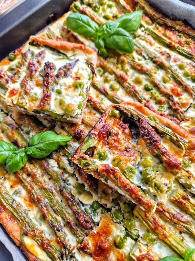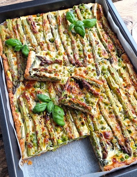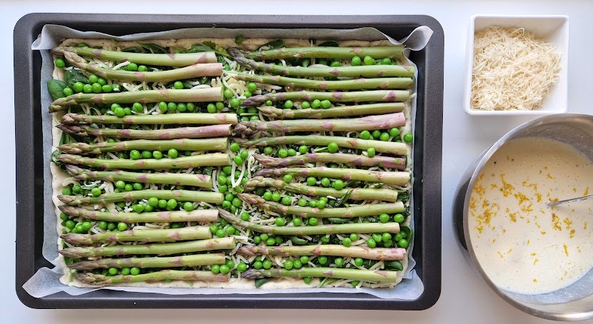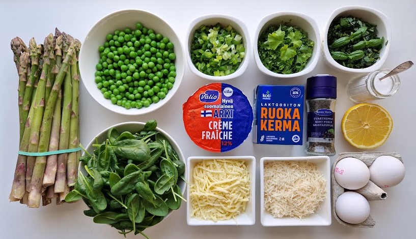 Keväisen parsapiirakan täytteessä ilahduin pinaatin ja pakasteherneiden lisäämisestä parsan kaveriksi. Tällöin ruokaisa piirakka sopii hyvin ateriaksi. Täytteeseen kannattaa valita ohuita parsoja, jotta ne ehtivät pehmetä ilman esikeittämistä.