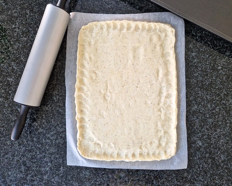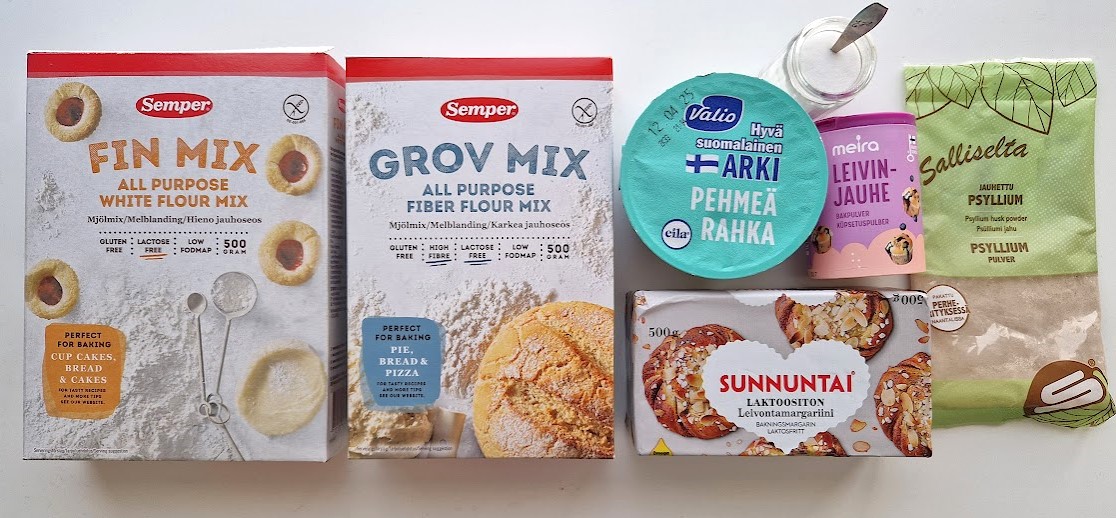 Gluteenittomaan pohjataikinaan käytin Semperin gluteenittomia jauhoseoksia. Lisäsin taikinaan psylliumia, joka helpottaa taikinan kaulittavuutta. Voin korvasin margariinilla. Toinen hyvä vaihtoehto pohjataikinaksi on gluteenittoman sadonkorjuupiirakkaohjeeni pohja, johon tulee myös rahkaa. Tällöin taikinasta riittää isolle uunipellille ja taikinan voi taputella sormin pellille.
