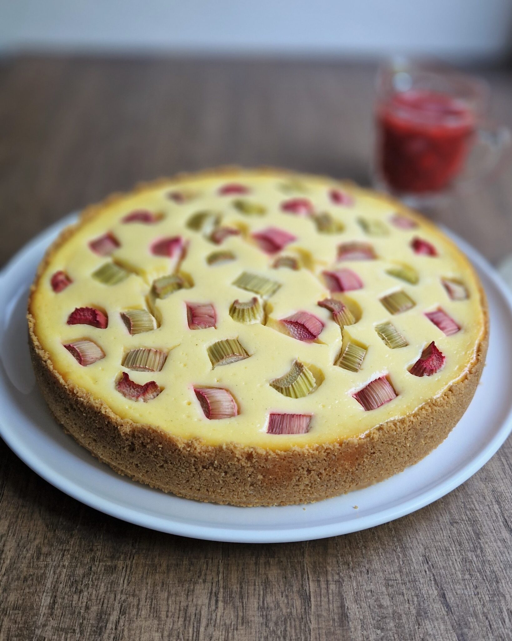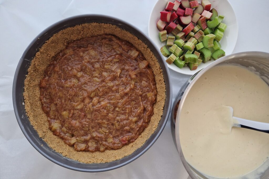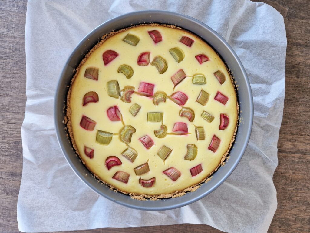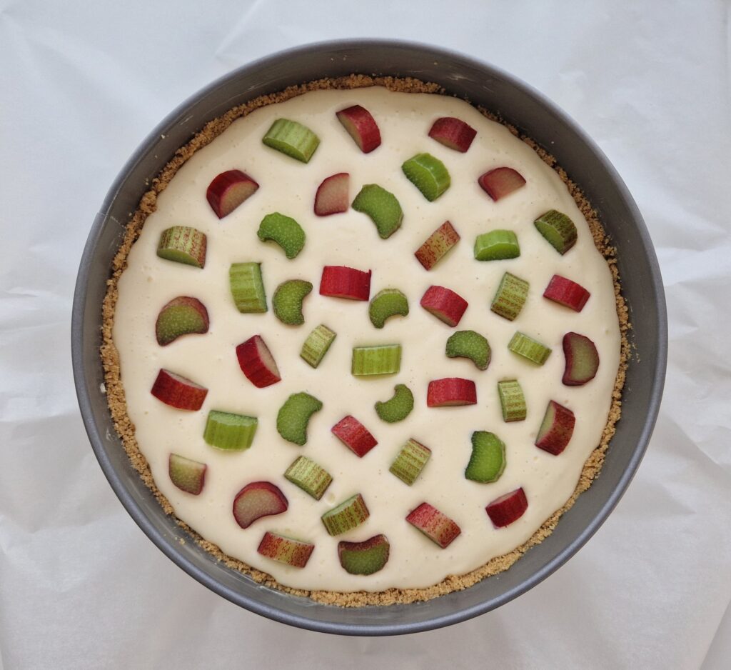 Raparperijuustokakun pinta vähän lohkeili, koska raparperipalat tuovat kosteutta juustokakun päälle ja jäähtyessään palat vetäytyvät pienemmiksi.