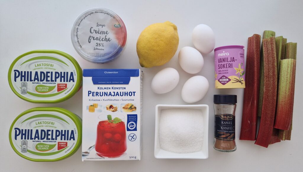 Viikonloppuna toin mökiltä raparperia ja näin pääsin leipomaan gluteenitonta raparperijuustokakkua. Blogissani on ohje gluteenittomaan amerikkalaiseen juustokakkuun. Se on taivaallisen hyvää. Päätin tuunata ohjetta siten, että keitän raparperimarmeladin kakun pohjalle ja ripottelen päälle raparperin paloja.