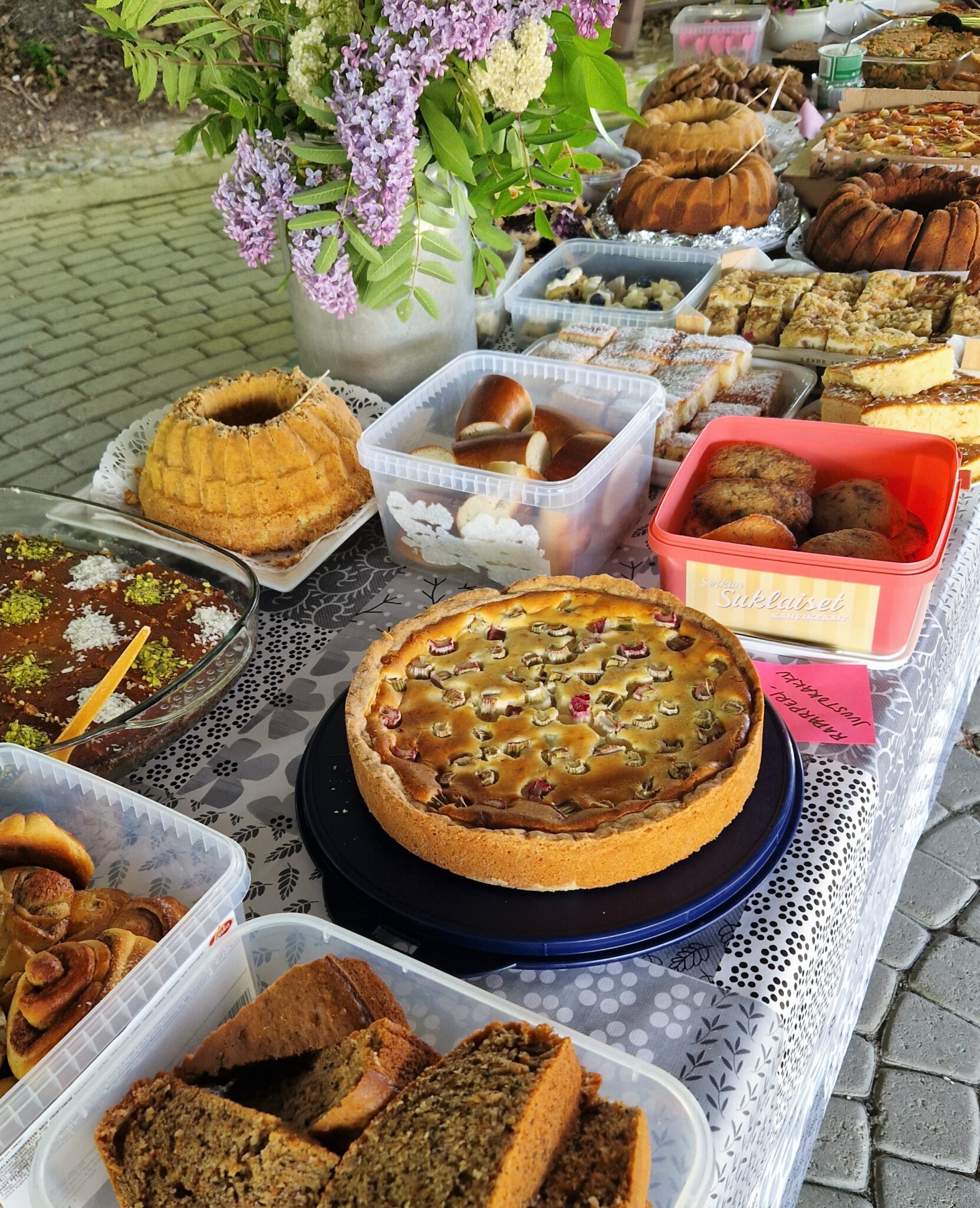 Viime viikolla töissä oli piknik-ilta nyyttikestiperiaatteella. Lähes kaikki osallistujat toivat jonkun leivonnaisen tai ruokaa. Kolme pöytää oli täynnä toinen toistaan ihanampia herkkuja. Itse leivoin tiikerikakun ja tietty gluteenittomana. Herkkujen joukosta bongasin monta hyvää leivontaideaa, muun muassa paistetun raparperijuustokakun, joka oli tosi hyvää.