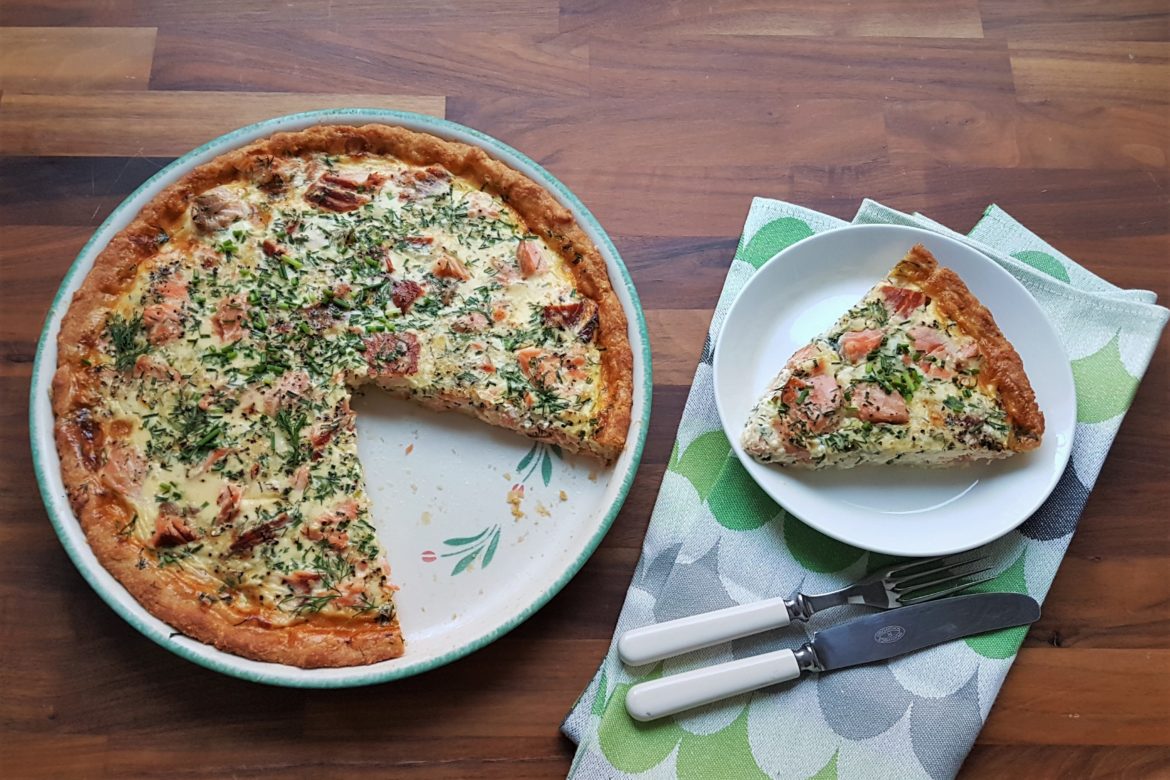 Lisäsin pohjaan myös kermaviiliä, joka sitoo hyvin taikinaa ja sopii lohen kanssa hyvin yksiin. Kalana voit käyttää lohta tai kirjolohta joko kylmäsavustettuna tai lämminsavustettuna. Itse käytin lämminsavustettua kirjolohta. Lohi tahtoo helposti hajota, kun sitä leikkaa palasiksi.