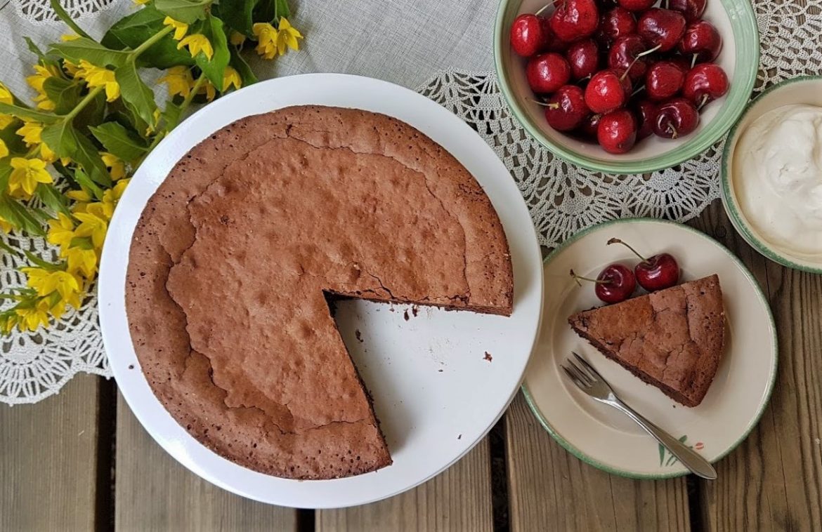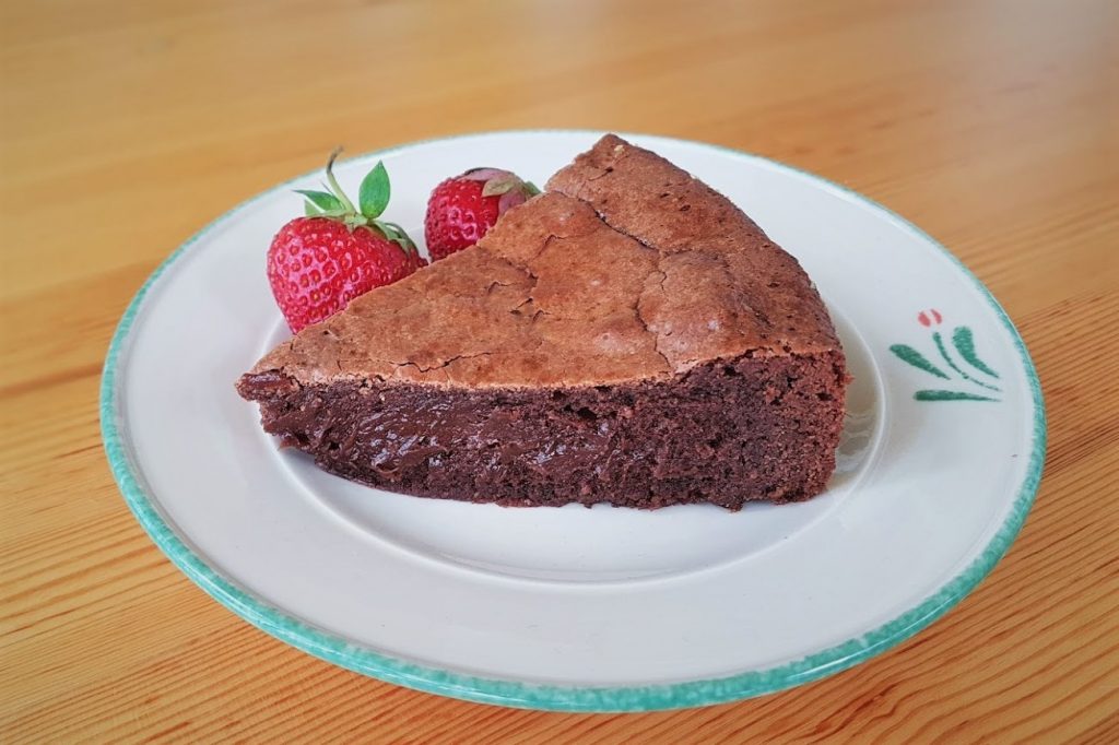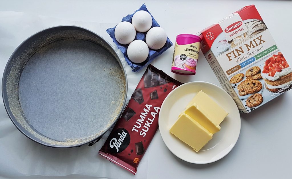 Gluteeniton mutakakku tehdään sulatetusta gluteenittomasta tummasta suklaasta ja voista, kananmuna-sokerivaahdosta ja jauhoista. Gluteenittoman hienon jauhoseoksen lisäksi laitoin taikinaan mantelijauhetta. Mielestäni manteli sopii erinomaisesti suklaan kaveriksi, antaa hienostuneen maun kakkuun. Voit leipoa kakun myös käyttämällä pelkästään gluteenitonta jauhoseosta. Niinkin onnistuu.