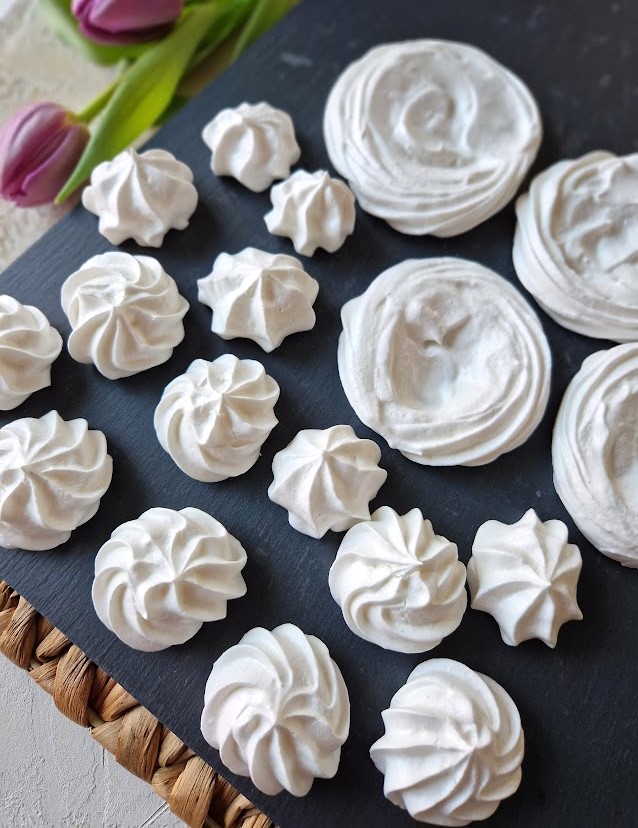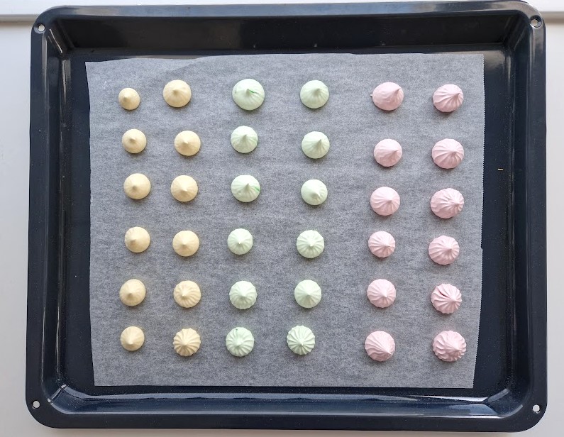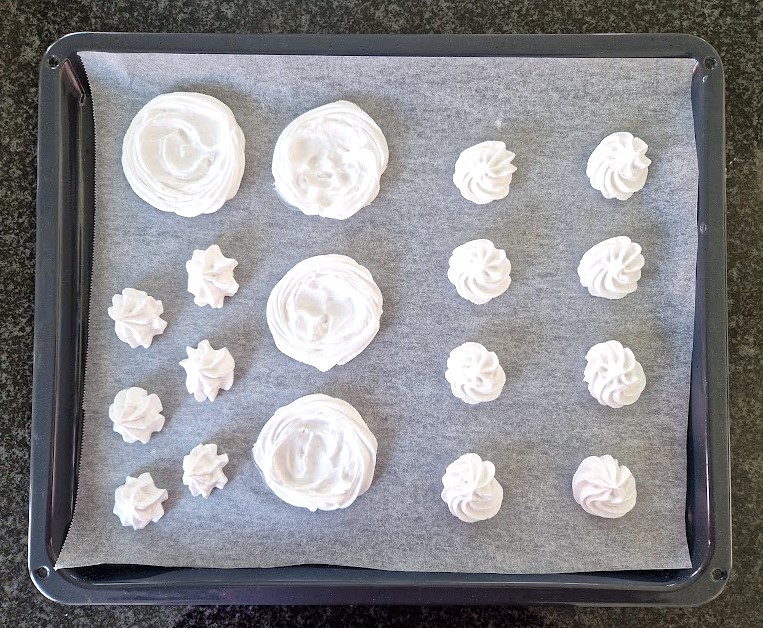 Pursota vaahdosta haluamasi muotoisia marenkeja pellille. Voit myös lusikalla nostaa pieniä marenkeja pellille. Marenkivaahdosta voi tehdä marenkien lisäksi tai asemasta ison tai pieniä marenkilevyjä pavlovaa varten.