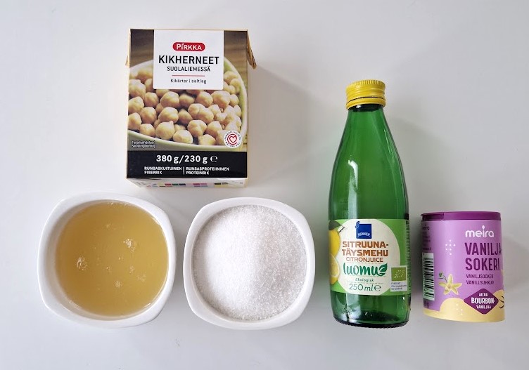 Vegaanisiin marenkeihin tarvitset kikherneiden lientä eli aquafabaa ja sokeria. Lisäksi laitoin vaniljasokeria ja sitruunamehua mausteeksi.