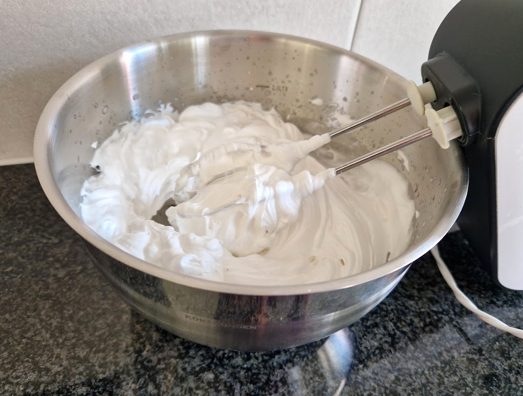 Kikherneliemen riittävä vaahdottaminen on onnistumisen edellytys. Vaahdotin pelkkää lientä ensin 5 minuuttia. Sen jälkeen lisäsin teelusikalliset vaniljasokeria ja sitruunamehua. Sitruunamehu tukevoittaa vaahtoa. Sokeri kannattaa lisätä pienissä erissä, jotta se ehtii sulaa vaahdotuksen aikana. Toisen vaiheen vaahdottamiseen meni reilut 5 minuuttia. Sähkövatkaimen teho vaikuttaa tarvittavaan aikaan. Minulla on aika tehokas peli. Vaahto on valmis, kun se on hyvin topakkaa ja pysyy kulhossa, vaikka kääntäisit kulhon ylösalaisin.